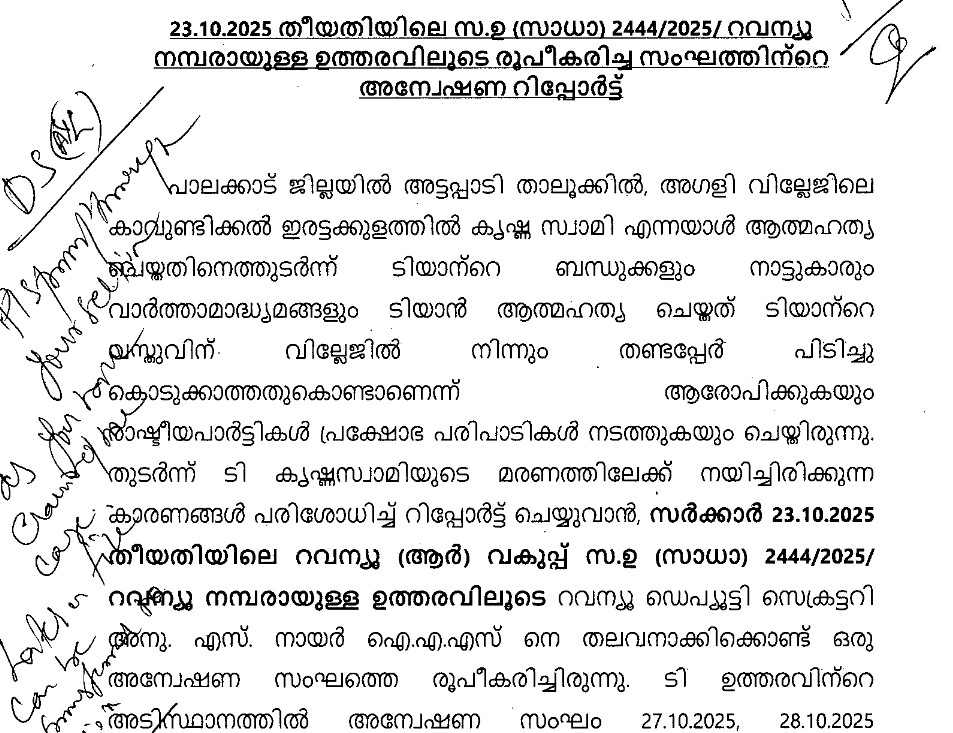 തന്റെ അമ്മയുടെ രണ്ട് ഏക്കർ ഭൂമിക്ക് മറ്റൊരാളിന് നികുതിയടച്ച് നൽകി എന്ന് അറിഞ്ഞതോടെയാണ് കൃഷ്ണസ്വാമി ആത്മഹത്യ ചെയ്തത്. തഹസീൽദാരും ഡെപ്യൂട്ടി കളക്ടറും അന്വേഷണം നടത്തി നൽകിയ ആദ്യ റിപ്പോർട്ടുകളിൽ കർഷകൻ ഭൂമി വിറ്റു എന്നാണ് കണ്ടെത്തിയത്. എന്നാൽ റവന്യൂ സെക്രട്ടറി എം.ജി രാജമാണിക്യത്തിന് ഈ വ്യാഖ്യാനത്തിൽ സംശയം തോന്നി. അദ്ദേഹം, കർഷകന്റെ ആത്മഹത്യ അന്വേഷിക്കുന്നതിന് ഡെപ്യൂട്ടി സെക്രട്ടറി അനു എസ്. നായരുടെ നേതൃത്വത്തിൽ പ്രത്യേകസംഘത്തെ നിയോഗിച്ച് ഒക്ടോബർ 23ന് ഉത്തരവിട്ടു. അവർ 2025 ഒക്ടോബർ 27ന് അട്ടപ്പാടിയിലെത്തി രണ്ട് ദിവസം അന്വേഷണം നടത്തി. അതോടെ വ്യാജരേഖ ഉണ്ടാക്കി ഭൂമി തട്ടിയെടുത്തതാണെന്ന് അന്വേഷണത്തിൽ കണ്ടെത്തി.