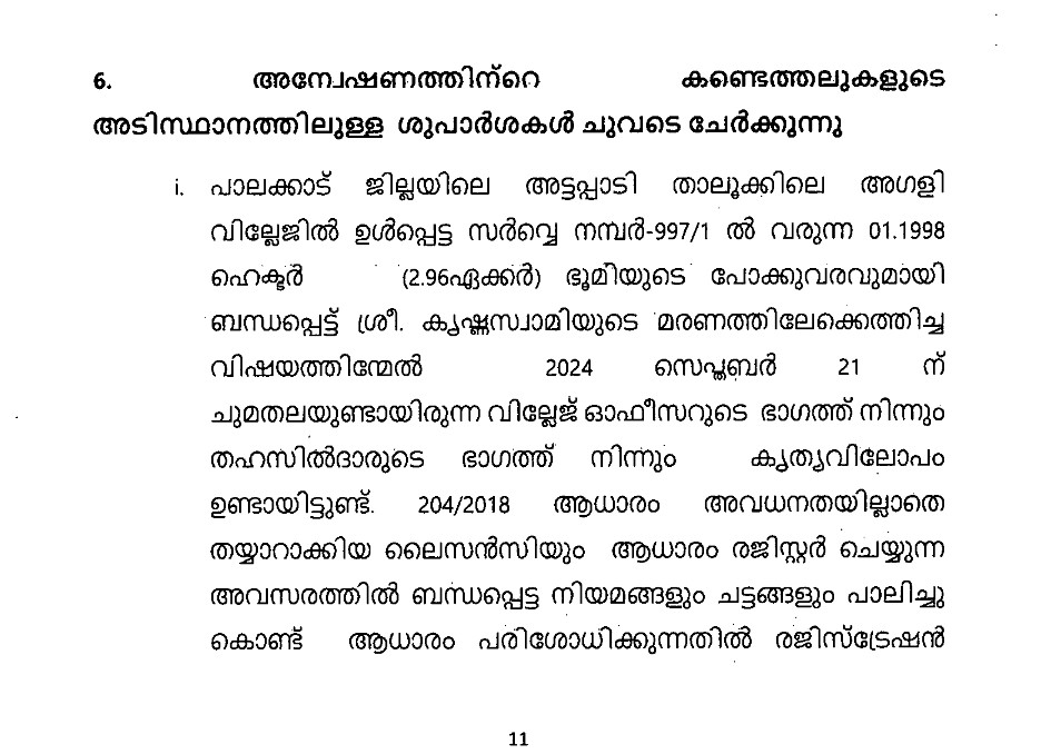 2024 സെപ്റ്റംബർ 21ന് ചുമതലയുണ്ടായിരുന്ന അഗളി വില്ലേജ് ഓഫീസറുടെയും തഹസീൽദാരുടെയും ഭാഗത്ത് നിന്നും കൃത്യവിലോപം ഉണ്ടായി. അതുപോലെ ആധാരം എഴുത്തുകരാനും രജിസ്ട്രേഷൻ അധികാരികളും വീഴ്ച വരുത്തി. ഇക്കാര്യത്തിൽ വകുപ്പുതല അന്വേഷണം നടത്തണമെന്നാണ് റിപ്പോർട്ടിലെ ശിപാർശ. അട്ടപ്പാടിയിലെ ആറ് വില്ലേജുകളിൽ നൽകിയിട്ടുള്ള മുഴുവൻ ലാൻഡ് ട്രൈബ്യൂണൽ പട്ടയങ്ങളുടെയും ഫയലുകൾ ഡിജിറ്റൽ ചെയ്യണം. റീസർവ്വേ നടന്ന കാലഘട്ടത്തിൽ തയ്യാറാക്കിയ എ ആൻഡ് ബി രജിസ്റ്ററുകൾ ഡിജിറ്റൽ ചെയ്യണം.