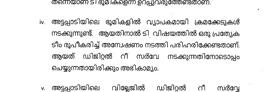 ഡിജിറ്റൽ റീസർവേ നടന്നുവരുമ്പോൾ അട്ടപ്പാടിയിലെ ആദിവാസി ഭൂമികളിൽ അതിർത്തിയില്ല എങ്കിലും ബന്ധപ്പെട്ട സർവേയർ നിലവിലുള്ള സർവ്വേ സ്കെച്ചിലെ സബ് ഡിവിഷൻ അതിർത്തി പ്രകാരം അളന്ന് തിട്ടപ്പെടുത്തി ഡിജിറ്റൽ രേഖകളിൽ ഉൾപ്പെടുത്തി കൊടുക്കുന്നില്ല എങ്കിൽ ആദിവാസി ഭൂമി ഡിജിറ്റൽ സർവേക്ക് ശേഷം വീണ്ടും അന്യാധീനപ്പെടാൻ ഇടയാകും. അതിനാൽ ഇത് സംബന്ധിച്ച വ്യക്തമായ മാർഗ്ഗനിർദേശം ഡിജിറ്റൽ സർവീസ് ടീമിന് നൽകണം.