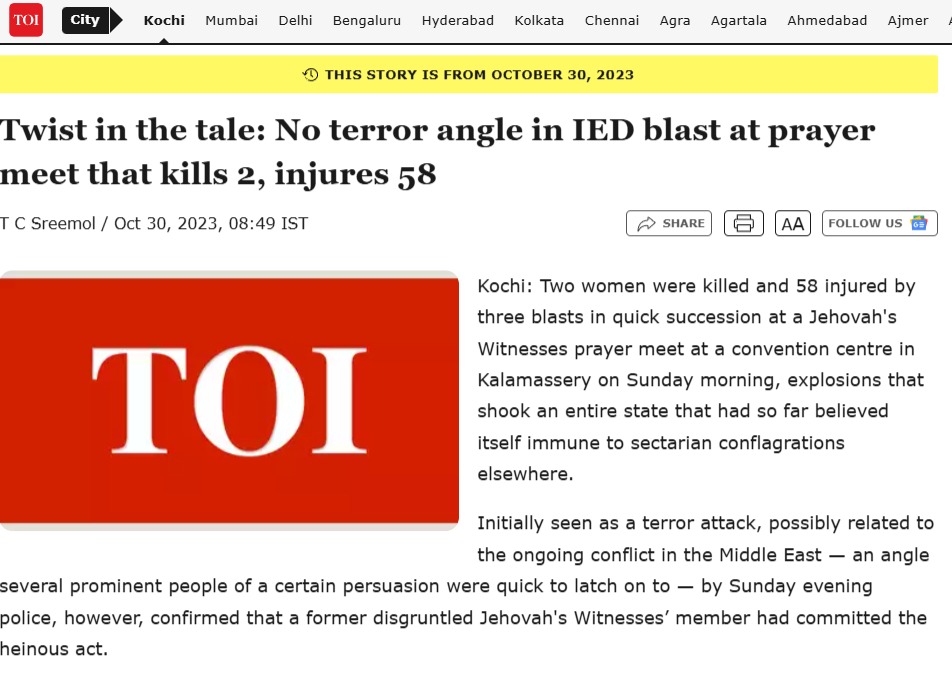 ടൈംസ് ഓഫ് ഇന്ത്യ ഒക്ടോബര് 30ന് പ്രസിദ്ധീകരിച്ച റിപ്പോര്ട്ടിന്റെ തലക്കെട്ട് Twist in the tale: No terror angle in IED blast at prayer meet that kills 2, injures 58- ‘സ്ഫോടനത്തില് ‘ടെറര് ആങ്കിള്’ ഇല്ല എന്നാണ്. ടെറര് ആങ്കിള് എന്നതിനെ എങ്ങനെയാണ് നിര്വചിക്കുന്നത് എന്ന ചോദ്യമാണ് ഈ തലക്കെട്ട് ഉയര്ത്തുന്നത്. “മധ്യേഷ്യയില് തുടരുന്ന സംഘര്ഷവുമായി ബന്ധപ്പെട്ടുള്ള തീവ്രവാദ ആക്രമണമായി ആദ്യം പലരും കരുതിയെങ്കിലും ഞായറാഴ്ച വൈകുന്നേരത്തോടുകൂടി ഈ കുറ്റകൃത്യം ചെയ്തത്, അസംതൃപ്തനായ മുന് യഹോവാ സാക്ഷിയാണെന്ന് വിവരങ്ങള് കിട്ടി.” ടി.സി ശ്രീമോള് എഴുതുന്നു. ഈ വിവരം ടൈംസ് ഓഫ് ഇന്ത്യയുടെ കാഴ്ചയില് ‘കഥയിലെ ട്വിസ്റ്റ്’ ആണ്. ഭീകരവാദത്തെക്കുറിച്ച് ആഗോളമായി നിലനില്ക്കുന്ന സ്റ്റീരിയോടൈപ് ചിന്ത പ്രകടമാക്കുന്ന റിപ്പോര്ട്ടാണിത്. എലത്തൂര് ട്രെയ്ന് തീവെപ്പിനെക്കുറിച്ചും കളമശ്ശേരി സ്ഫോടനത്തെ കുറിച്ച് റിപ്പോര്ട്ട് ചെയ്ത പല മാധ്യമങ്ങളും പരാമര്ശിച്ചു. ഈ റിപ്പോര്ട്ടിങ്ങുകളെല്ലാം മനഃശാസ്ത്രപരമായി പ്രേക്ഷകരെ സ്വാധീനിക്കുന്ന സ്വഭാവമുള്ളതാണ്.