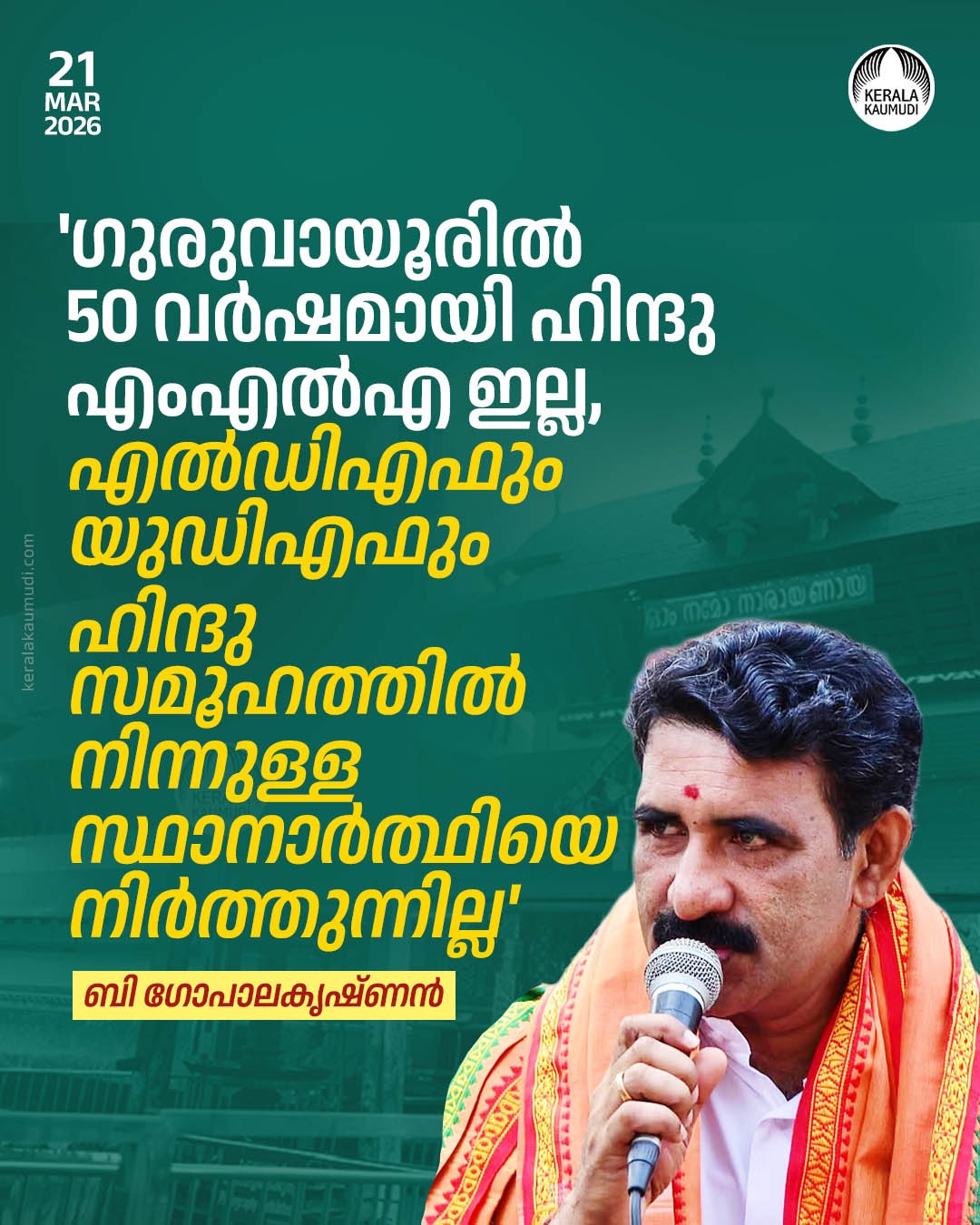 നിയമസഭാ തിരഞ്ഞെടുപ്പിലെ ബി.ജെ.പിയുടെ രണ്ടാംഘട്ട സ്ഥാനാര്ഥിപ്പട്ടിക പുറത്തുവന്നതോടെ, ബി.ജെ.പി സംസ്ഥാന വൈസ് പ്രസിഡന്റ് അഡ്വ. ബി. ഗോപാലകൃഷ്ണന് തിരഞ്ഞെടുപ്പ് പ്രചാരണം ആരംഭിച്ചു. ഇതിന്റെ ഭാഗമായി ഗുരുവായൂരില് കഴിഞ്ഞ അരനൂറ്റാണ്ടുകാലമായി നിലനില്ക്കുന്ന രാഷ്ട്രീയ സാഹചര്യങ്ങള്ക്കെതിരെ അദ്ദേഹം ഫേസ്ബുക്കില് വീഡിയോ പങ്കുവെച്ചു. ഗുരുവായൂരില് ഹൈന്ദവ വിശ്വാസികളുടെ താല്പര്യങ്ങള് സംരക്ഷിക്കാന് ഒരു ഹിന്ദു എംഎല്എ വേണമെന്നായിരുന്നു അദ്ദേഹത്തിന്റെ വാദം: അയോധ്യ വീണ്ടെടുത്തു. ഇനി ഗുരുവായൂരപ്പന്റെ മണ്ണ് വീണ്ടെടുക്കാനുള്ള പടയണിയാണ്. അന്തര്ദേശീയ തീര്ത്ഥാടന മണ്ണായ ഗുരുവായൂരില് അര നൂറ്റാണ്ടായി ഒരു ഹിന്ദു എംഎല്എ ഉണ്ടായിട്ടില്ല. അമ്പല കൊള്ളക്കാരും അമ്പല വിരോധികളും കൈയ്യടക്കിയ ഗുരുവായൂരപ്പന്റെ മണ്ണ് വീണ്ടെടുക്കാന് ഗുരുപവനപുരിയില് ഞാന് എത്തുന്നു. നിങ്ങള് കൂടെ ഉണ്ടാകണം. അയോധ്യ വീണ്ടെടുത്ത പോലെ ഗുരുവായൂരപ്പന്റെ മണ്ണ് വിണ്ടെടുക്കാന്. അതിപ്പോ മലപ്പുറം ലീഗ് ആയാലും, ജമാഅത്തെ ഇസ്ലാമി ആയാലും,എസ്ഡിപിഐ ആയാലും എനിക്ക് നിലപാട് ഒന്നേയുള്ളു. ഒരു ഇസ്ലാമിക വര്ഗീയവാദിയുടെയും വോട്ട് എനിക്ക് വേണ്ട. അത് എന്റെ നിലപാടാണ് (19 മാര്ച്ച്, ഫേസ്ബുക്ക്/ അഡ്വ. ബി ഗോപാലകൃഷ്ണന്).