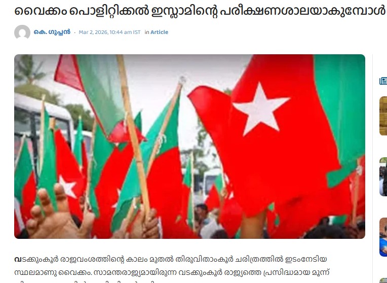 വൈക്കം ക്ഷേത്രം ടിപ്പുവിന്റെ കാലത്ത് ആക്രമിക്കപ്പെട്ടു. വൈക്കം പത്മനാഭപിള്ള ടിപ്പുവിനെ പരാജയപ്പെടുത്തി. കേരളത്തിന്റെ നവോത്ഥാന ചരിത്രത്തില് വൈക്കം പ്രധാന കേന്ദ്രമായിരുന്നു. ദലിതര് തുടക്കത്തില് നവോത്ഥാന പ്രസ്ഥാനങ്ങളുടെ ഭാഗമായെങ്കിലും അവര്ക്ക് ഒന്നും നേടാനായില്ല. അദൃശ്യമായ ഈ വിഭാഗം പ്രായപൂര്ത്തി വോട്ടവകാശവും പങ്കാളിത്ത ജനാധിപത്യവും പ്രാബല്യത്തില് വന്ന ശേഷമാണ് ഒരു വോട്ടുബാങ്ക് എന്ന നിലയിലെങ്കിലും മുഖ്യധാരാ രാഷ്ട്രീയത്തില് ഭാഗമായത്. കേരളത്തില് ജമാഅത്തെ ഇസ്ലാമിയുടെ നേതൃത്വത്തിലുള്ള പൊളിറ്റിക്കല് ഇസ്ലാം വിവിധ രൂപത്തില് ഇടപെടലുകള് നടത്തികൊണ്ടിരിക്കുന്നു. ഇടത്-വലതു മുന്നണികള് അവരെ സമ്മര്ദ്ദ ശക്തിയായി വളര്ത്തി. ഇന്ന് എസ്ഡിപിഐയേയോ വെല്ഫയര് പാര്ട്ടിയേയോ നിഷേധിച്ചുകൊണ്ട് ലീഗിന് മുന്നോട്ട് പോകാനാവില്ല. കോണ്ഗ്രസ്സും ഈയൊരു പ്രതിസന്ധിയിലാണ്. 2026-ല് നിയമസഭാ തെരഞ്ഞെടുപ്പില് വൈക്കത്ത് പൊളിറ്റിക്കല് ഇസ്ലാം പിന്തുണയോടെ ഒരു ദലിത് ആക്റ്റിവിസ്റ്റ് യുഡിഎഫ് സ്ഥാനാര്ത്ഥിയായി എത്തും.