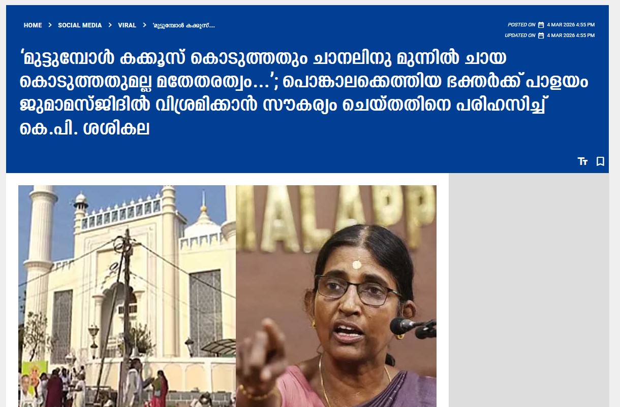 21. മുതിര്ന്ന സിപിഎം നേതാവ് ജി സുധാകരന് സിപിഎം വിടുന്നു എന്ന വാര്ത്തയെകുറിച്ച് ക്രിസ്ത്യന് ഐക്യവേദി എന്ന ഫേസ്ബുക്ക് പേജില് ഒരു കുറിപ്പ് പ്രത്യക്ഷപ്പെട്ടു. തത്കാലിക നേട്ടത്തിന് വേണ്ടി പൊളിറ്റിക്കല് ഇസ്ലാമിന് സ്തുതി പാടുന്ന ഹിന്ദു ക്രിസ്ത്യന് സഖാക്കള്ക്ക് സ്വരാജിന്റെയും സുധാകരന്റെയും രാഷ്ട്രീയ ജീവിതം ഒരു പാഠമാണെന്ന മുന്നറിയിപ്പാണ് പോസ്റ്റിന്റെ ഉള്ളടക്കം: ഹമാസിന് ജയ് വിളിച്ചു കൊണ്ടിരുന്ന എം സ്വരാജ് നിലമ്പൂര് മത്സരിക്കാന് ചെന്നപ്പോള് ജിഹാദികള് സംഘി ആക്കി തോല്പ്പിച്ചു വിട്ടത്തോടെ ഇനി തിരഞ്ഞെടുപ്പില് മത്സരിക്കാന് ഇല്ലെന്ന നിലപാടില് ആണ്. ഹമാസ് അനുകൂല നിലപാട് എടുത്തിട്ടും ആര്യാടന് ഷൗക്കത്തിനെതിരെ മത്സരിച്ച നിലമ്പൂരില് ഹമാസ് ആരാധകര് കാലു വാരുകയും ചെയ്തു. ശബരിമല വിഷയത്തിലെ നിലപാടുകള് കൊണ്ട് കക്ഷത്തില് ഇരുന്ന ഹിന്ദു വോട്ടും പോയതോടെ ഇനി മത്സരിക്കുന്നത് ബുദ്ധി അല്ല എന്ന് സ്വരാജ് തിരിച്ചറിഞ്ഞു. തത്കാലിക നേട്ടത്തിന് വേണ്ടി പൊളിറ്റിക്കല് ഇസ്ലാമിന് സ്തുതി പാടുന്ന ഹിന്ദു ക്രിസ്ത്യന് സഖാക്കള്ക്ക് സ്വരാജിന്റെയും സുധാകരന്റെയും രാഷ്ട്രീയ ജീവിതം ഒരു പാഠം ആണ്(05 മാര്ച്ച്, ഫേസ്ബുക്ക്/ക്രിസ്ത്യന് ഐക്യവേദി).
