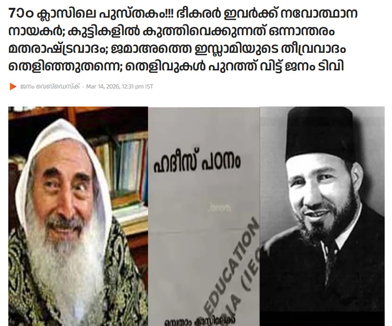 ജമാഅത്തെ ഇസ്ലാമിയുടെ വിദ്യാഭ്യാസ സ്ഥാപനങ്ങളില് പഠിപ്പിക്കുന്നത് മതരാഷ്ട്രവാദവും തീവ്രവാദവുമെന്ന് ജനം ടിവി. ഏഴാം ക്ലാസിലെ മദ്രസാ പാഠപുസ്തകമായ ഹദീസിലെ ഏഴാം അദ്ധ്യായത്തില് നവോത്ഥാന നായകര് എന്ന ഭാഗത്ത് പഠിപ്പിക്കുന്നത് മുസ്ലീം ബ്രദര്ഹുഡിലെ നേതാക്കളെ കുറിച്ചാണെന്നാണ് ജനം ടിവിയുടെ ആക്ഷേപം: ഏഴാം ക്ലാസിലെ മദ്രസാ പാഠപുസ്തകമായ ഹദീസിലെ ഏഴാം അദ്ധ്യായത്തില് നവോത്ഥാന നായകര് എന്ന ഭാഗമുണ്ട്. ഇവിടെ പഠിപ്പിക്കുന്നത് ആഗോള നിരോധിത ഭീകര സംഘടനയായ മുസ്ലീം ബ്രദര്ഹുഡിലെ നേതാക്കളെ കുറിച്ചാണ്. മുസ്ലീം ബ്രദര്ഹുഡ് സ്ഥാപകനും ഒന്നാന്തരം മതരാഷ്ട്രവാദിയുമായ ഹസനുല് ബന്ന, പിന്ഗാമി സയ്ദ് ഖുതബ് എന്നിവരെയാണ് നവോത്ഥാന നേതാക്കള് എന്ന് പറഞ്ഞ് കുട്ടികളെ പഠിപ്പിക്കുന്നത്. മൗദൂദിയെ കുറിച്ചും ഇതില് വിശദമായി പഠിപ്പിക്കുന്നുണ്ട്. ഹമാസ് എന്ന ഭീകര സംഘടനയെയും വിശുദ്ധരായി പ്രഖ്യാപിക്കുന്നുണ്ട്. ഇത് രൂപീകരിച്ച ഷെയ്ഫ് അഹമ്മദ് യാസിനും നവോത്ഥാന നായകനാണ്. മതസ്പര്ദ്ദ വളര്ത്തുന്നു എന്ന് കണ്ടെത്തിയതിനെ തുടന്ന് സംസ്ഥാന സര്ക്കാര് നടപടി നേരിട്ട ‘വഴിയടയാളവും’ സിലബസിന്റെ ഭാഗമാണ്. നിരോധിത ഭീകസംഘടനകളായ ഐഎസ്ഐഎസും അല്-ഖ്വയ്ദയും മുന്നോട്ട് വെക്കുന്ന ആശയങ്ങളെ ഇവരുടെ പുസ്തകത്തില് മഹദ് വചനങ്ങളാണ്. അള്ളാഹുവാണ് ഞങ്ങളുടെ നാഥന്. ഖുറാന് ആണ് ഞങ്ങളുടെ ഭരണഘടന, ജിഹാദാണ് മാര്ഗം എന്നാണ് ഇവര് കുട്ടികളെ പഠിപ്പിക്കുന്നത്. ഏഴാം ക്ലാസിന് പുറമേ ഒന്പതാം ക്ലാസിലെയും ഹദീസില് ഇത്തരം നിരവധി പാഠഭാഗങ്ങള് കാണം (7ാം ക്ലാസിലെ പുസ്തകം! ഭീകരര് ഇവര്ക്ക് നവോത്ഥാന നായകര്; കുട്ടികളില് കുത്തിവെക്കുന്നത് ഒന്നാന്തരം മതരാഷ്ട്രവാദം; ജമാഅത്തെ ഇസ്ലാമിയുടെ തീവ്രവാദം തെളിഞ്ഞുതന്നെ; തെളിവുകള് പുറത്ത് വിട്ട് ജനം ടിവി, 14 മാര്ച്ച്, ജനം ടിവി).