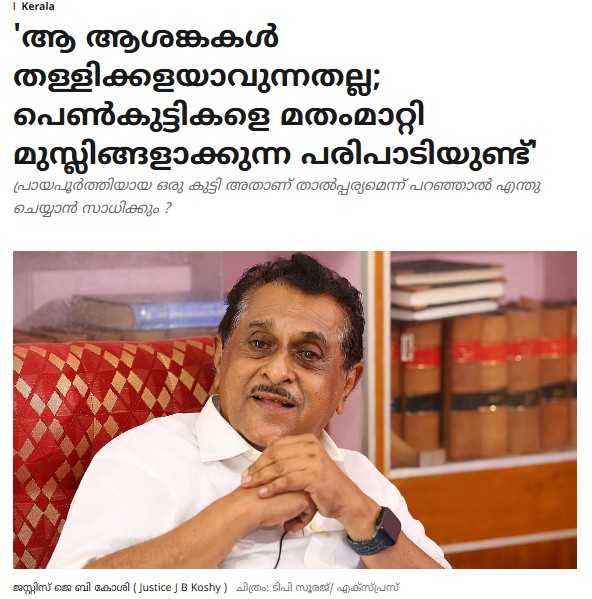 കേരളത്തിലെ ലൗ ജിഹാദ് ആരോപണം തള്ളിക്കളയാവുന്നതല്ലെന്ന് ജസ്റ്റിസ് ജെ.ബി കോശി: ഈ ആശങ്കകള്ക്ക് ചില അടിസ്ഥാനങ്ങളുണ്ട്. പെണ്കുട്ടികളെ മതംമാറ്റി മുസ്ലീങ്ങളാക്കുന്ന പരിപാടിയുണ്ട്. പഠിച്ചുകൊണ്ടിരിക്കുന്ന സമയത്തുതന്നെ പെണ്കുട്ടികളെ വീടുകളിലെത്തിച്ച് പഠിപ്പിക്കുന്നുണ്ട്. ഞാന് ജഡ്ജിയായിരിക്കുമ്പോള് എന്റെ മുമ്പില് ഇത്തരം കേസുകള് വന്നിട്ടുണ്ട്. ദി ന്യൂ ഇന്ത്യന് എക്സ്പ്രസിന്റെ എക്സ്പ്രസ് ഡയലോഗ്സില് സംസാരിക്കുകയായിരുന്നു അദ്ദേഹം. ക്രിസ്ത്യന് കുടുംബങ്ങളിലെ പെണ്കുട്ടികളെ മുസ്ലീം പുരുഷന്മാര് ഇസ്ലാമിലേക്ക് മതം മാറ്റാന് പ്രലോഭിപ്പിച്ചതായി ആരോപിക്കപ്പെടുന്ന നിരവധി കേസുകള് ഞാന് കൈകാര്യം ചെയ്തിരുന്നു. ഇവ പലപ്പോഴും ഹേബിയസ് കോര്പ്പസ് ഹര്ജികളായിട്ടാണ് ആരംഭിക്കുന്നത്. കേസുകള് പുരോഗമിക്കുമ്പോഴേക്കും, പെണ്കുട്ടികള് ഇസ്ലാമിലേക്ക് മതം മാറിയെന്നും അവരുടെ പേരുകള് പോലും മാറ്റിയെന്നും വ്യക്തമാകും. ഒരു നമ്പൂതിരി പെണ്കുട്ടി മുസ്ലീം ചെറുപ്പക്കാരനുമായി പ്രണയത്തിലായി. റംസാന് സമയത്തും മറ്റും വീട്ടില് കൊണ്ടുപോകും. നോമ്പു നോക്കാന് പ്രേരിപ്പിക്കും. ക്രമേണ ആ പെണ്കുട്ടി മുസ്ലീം മതവിശ്വാസിയായി മാറി. കുറേക്കഴിഞ്ഞ് പെണ്കുട്ടിയെ കാണാതായപ്പോള് ഹേബിയസ് കോര്പ്പസ് ഹര്ജിയുമായി വീട്ടുകാരെത്തി. കോടതി ചോദിച്ചപ്പോള് മുസ്ലീം വിശ്വാസത്തിലാണ് ഇഷ്ടമെന്നാണ് മറുപടി നല്കിയത്. അപ്പോഴേക്കും വിവാഹമൊക്കെ കഴിഞ്ഞിരുന്നു (‘ആ ആശങ്കകള് തള്ളിക്കളയാവുന്നതല്ല; പെണ്കുട്ടികളെ മതംമാറ്റി മുസ്ലീങ്ങളാക്കുന്ന പരിപാടിയുണ്ട്’, 22 മാര്ച്ച്, സമകാലിക മലയാളം).