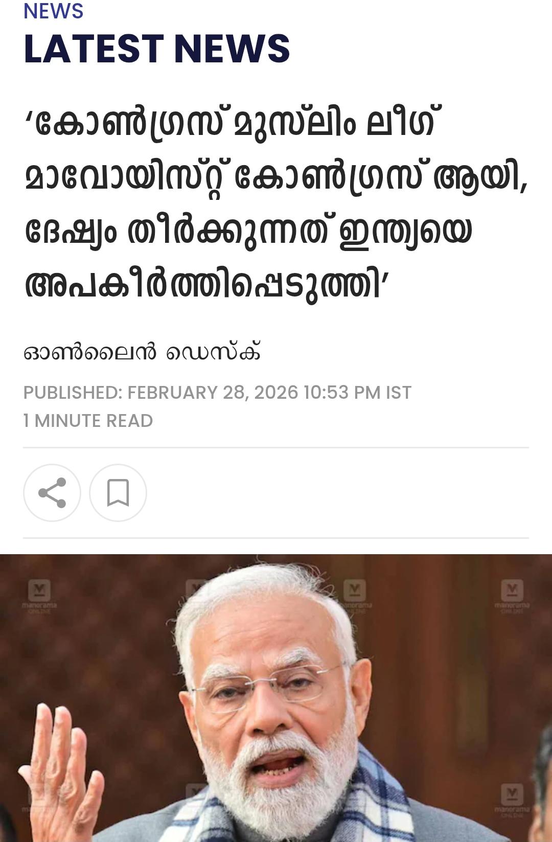 15. ‘കേരളത്തിലെ കോണ്ഗ്രസ് മുസ്ലീം ലീഗ് മാവോയിസ്റ്റ് കോണ്ഗ്രസായി മാറിയിരിക്കുകയാണ്’ എന്ന് പ്രധാനമന്ത്രി നരേന്ദ്രമോദി- എന്ഡിഎ തിരഞ്ഞെടുപ്പ് കണ്വെന്ഷന് ഉദ്ഘാടനം ചെയ്യുന്നതിനിടെയായിരുന്നു പ്രധാനമന്ത്രിയുടെ പ്രതികരണം (കേരളത്തിലെ കോണ്ഗ്രസ് മുസ്ലീം ലീഗ് മാവോയിസ്റ്റ് കോണ്ഗ്രസായി മാറിയിരിക്കുകയാണ്’ എന്ന് പ്രധാനമന്ത്രി നരേന്ദ്രമോദി, ഫേസ്ബുക് പോസ്റ്റ്, 12 മാര്ച്ച്, സമകാലിക മലയാളം).