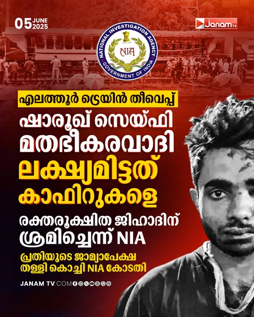 കോഴിക്കോട് ജില്ലയിലെ എലത്തൂരിൽ നടന്ന ട്രെയിൻ തീവയ്പ്പ് (2023 ഏപ്രിൽ 2) കേസിൽ പ്രതിയായ ഷാരൂഖ് സൈഫിക്കെതിരേ എൻഐഎ കുറ്റപത്രം സമർപ്പിച്ചു. ഇയാൾക്കെതിരേ തെളിവുകളേക്കാൾ ഏതാനും ആരോപണങ്ങളാണ് എൻഐഎ കുറ്റപത്രത്തിൽ എഴുതിച്ചേർത്തത്: ഇയാൾ മതതീവ്രവാദിയാണ്. ജിഹാദ് നടത്താൻ ശ്രമിച്ചു. ഡൽഹിയിലെ ഷഹീൻ ബാഗിൽ താമസിക്കുന്നയാളാണ്. ഭീകരത പ്രചരിപ്പിക്കുക എന്നതായിരുന്നു ലക്ഷ്യം. ഓൺലൈൻ ഉള്ളടക്കത്തിലൂടെ തീവ്രവാദിയായി മാറി. പാകിസ്താനിൽ നിന്ന് പ്രവർത്തിക്കുന്ന മതപ്രഭാഷകരുടെ പ്രസംഗങ്ങൾ അയാൾ പതിവായി കേട്ടിരുന്നു. ഓൺലൈനിൽ ഷാരൂഖ് ഫോളോ ചെയ്തവരിൽ സാക്കിർ നായിക്, പാകിസ്താൻ മതപ്രഭാഷകരായ താരിഖ് ജമീൽ, ഇസ്രാർ അഹമ്മദ്, തൈമു അഹമ്മദ് എന്നിവർ ഉൾപ്പെടുന്നു. ഈ തീവ്രവാദ സ്വാധീനത്തിന്റെ അടിസ്ഥാനത്തിലാണ് സൈഫി സ്വതന്ത്രമായി ആക്രമണം നടത്താൻ തീരുമാനിച്ചത്. ജിഹാദി പ്രവർത്തനങ്ങളിലും പങ്കുണ്ട്. ആക്രമണത്തിന് കേരളം തിരഞ്ഞെടുത്തത് തിരിച്ചറിയാതിരിക്കാനാണ്. ജനങ്ങളെ ഭീതിയിലാക്കുക എന്നതായിരുന്നു ലക്ഷ്യം. ലക്ഷ്യമിട്ടത് കാഫിറുകളെയാണ്. കാഫിറുകളെ (അവിശ്വാസികളെ) കൊല്ലുന്നത് തന്റെ പാപങ്ങൾക്ക് മോചനം നേടാനുള്ള മാർഗമാണെന്ന് അയാൾ വിശ്വസിച്ചിരുന്നു. (കേരള എലത്തൂർ ട്രെയിൻ തീവെപ്പ് – പാക് മതപ്രഭാഷകരുടെ സ്വാധീനത്താൽ മതഭീകരനായ ഷാരൂഖ് സൈഫി കാഫിറുകളെ ലക്ഷ്യം വച്ചുള്ളതാണെന്ന് എൻഐഎ., ജൂൺ 5, ഓർഗനൈസർ. എലത്തൂർ ട്രെയിൻ തീവെപ്പ് ഷാരൂഖ് സെയ്ഫി മതഭീകരവാദി, ലക്ഷ്യമിട്ടത് കാഫിറുകളെ, ജൂൺ 5, ജനം ടിവി).