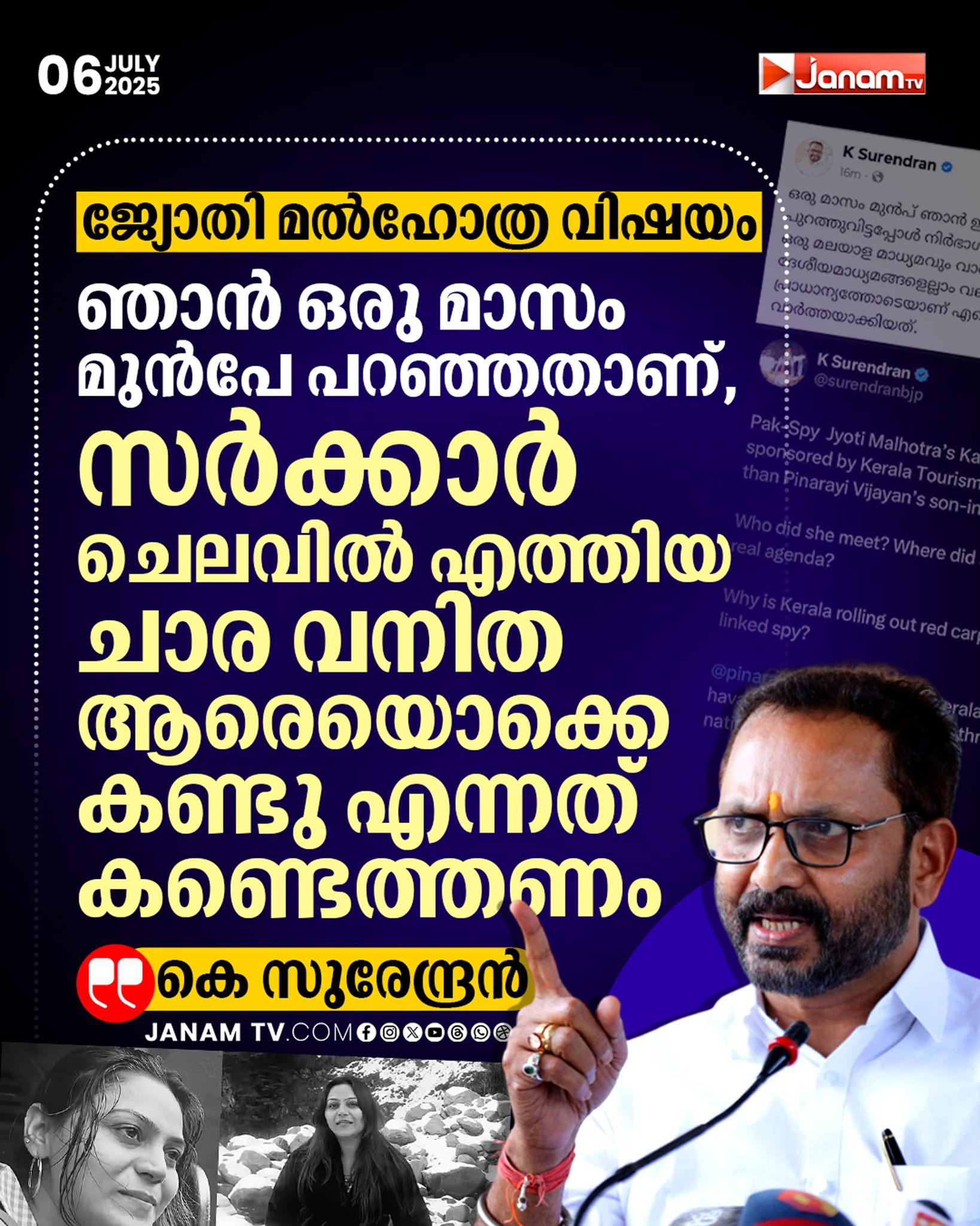 ഈ വിഷയത്തിൽ അദ്ദേഹം എക്സിൽ പോസ്റ്റും ചെയ്തു: “പാക്-ചാരയായ ജ്യോതി മൽഹോത്രയുടെ കണ്ണൂർ യാത്ര സ്പോൺസർ ചെയ്തത് കേരള ടൂറിസമാണ്. പിണറായി വിജയന്റെ മരുമകനാണ് ഇത് നടത്തുന്നത്. അവർ ആരെയാണ് കണ്ടത്? അവർ എവിടെ പോയി? യഥാർത്ഥ അജണ്ട എന്താണ്? പാക് ബന്ധമുള്ള ഒരു ചാരയ്ക്ക് കേരളം എന്തിനാണ് ചുവപ്പ് പരവതാനി വിരിക്കുന്നത്.” (ജൂൺ 1, ജനം ടിവി, മെയ് 31 സുരേന്ദ്രന്റെ ഫേസ്ബുക്ക് പോസ്റ്റ്).