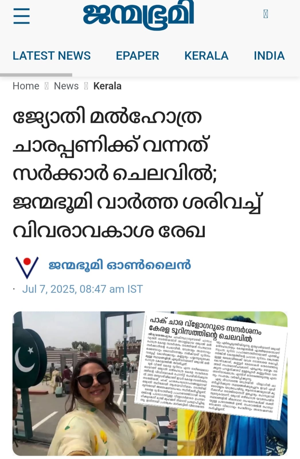 ജ്യോതി മൽഹോത്ര കേരളത്തിലെത്തിയത് ടൂറിസം വകുപ്പിന്റെ ക്ഷണപ്രകാരമെന്ന് വിവരാവകാശരേഖ ലഭിച്ചതായി ജൂൺ 6ാം തിയ്യതി ജന്മഭൂമി വീണ്ടും റിപ്പോർട്ട് ചെയ്തു. 2024 ജനുവരി മുതൽ 2025 മേയ് വരെ ടൂറിസം വകുപ്പ് സാമൂഹിക മാധ്യമ ഇൻഫ്ളുവൻസേഴ്സിനെ ഉപയോഗിച്ച് പ്രമോഷൻ നടത്തിയവരുടെ പട്ടികയിൽ ജ്യോതി മൽഹോത്രയും ഉണ്ടെന്നായിരുന്നു. ഡൽഹിയിൽ നിന്ന് ബെംഗളുരുവിലെത്തിയ ജ്യോതി കണ്ണൂരിലാണ് വിമാനമിറങ്ങിയത്. കണ്ണൂരിൽ യാത്ര ചെയ്യുന്നതിന്റെയും തെയ്യം കാണുന്നതിന്റെയും വിഡിയോകൾ സമൂഹമാധ്യമത്തിൽ പോസ്റ്റ് ചെയ്തിരുന്നു. യാത്ര, ഭക്ഷണം, താമസം തുടങ്ങിയ ചെലവുകളും ദൃശ്യങ്ങൾ പകർത്താനുള്ള സൗകര്യവും അധികൃതർ ഒരുക്കി. വേതനവും സർക്കാർ നൽകിയെന്നായിരുന്നു അവരുടെ കണ്ടെത്തൽ (ജൂൺ 6, ജന്മഭൂമി).
