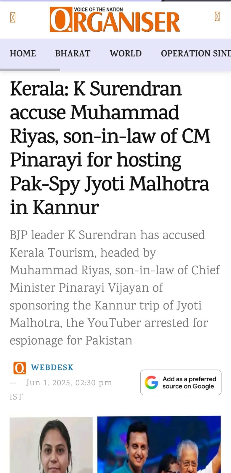 കൂടുതൽ വിശദാംശങ്ങളും ആരോപണങ്ങളുമായി ഓർഗനൈസറും വാർത്ത കൊടുത്തു. കാസർഗോഡിന്റെ കള്ളക്കടത്ത് ചരിത്രം, ഹവാലബന്ധം, ഐഎസ് ബന്ധം തുടങ്ങി പല ആരോപണങ്ങളും ഒരേ വാർത്തയിൽ സൂചന നൽകി: 2024 ഡിസംബറിൽ ജമ്മു കശ്മീരിലെ അഞ്ച് ദിവസത്തെ പര്യടനം പൂർത്തിയാക്കിയ ശേഷം 2025 ജനുവരിയിലാണ് ജ്യോതി കേരളത്തിലെത്തിയത്. ജനുവരി 15 നാണ് കണ്ണൂരിലെത്തിയത്. കണ്ണൂരിലെ ആലക്കാടുള്ള കാശിപുരം വനശാസ്താ ക്ഷേത്രം സന്ദർശിച്ചു. ആലക്കാടിൽ നിന്ന് വെറും 17 കിലോമീറ്റർ അകലെയാണ് ഏഴിമല നാവിക പരിശീലന അക്കാദമി സ്ഥിതി ചെയ്യുന്നത്. കാസർഗോഡ് ജില്ലയിലെ കുപ്രസിദ്ധമായ പടന്ന ഗ്രാമത്തിൽ നിന്ന് ഏകദേശം മുപ്പത് മിനിറ്റ് മാത്രം അകലെയാണ് ഈ ആലക്കാട് (20 കിലോമീറ്റർ). പടന്നയിൽ നിന്നുള്ള ഏകദേശം 11 യുവാക്കൾ മുമ്പ് ഇസ്ലാമിക ഭീകര സംഘടനയായ ഐഎസിൽ ചേർന്നിരുന്നു എന്നത് ശ്രദ്ധേയമാണ്. തീവ്രവാദ പ്രവർത്തനങ്ങളുടെയും ഹവാല പണ കൈമാറ്റങ്ങളുടെയും ദീർഘകാല ചരിത്രവും കാസർഗോഡ് ജില്ലയ്ക്കുണ്ട്. പിന്നീട്, കൊച്ചിയിലെ തന്ത്രപ്രധാന സ്ഥലങ്ങളും ജ്യോതി സന്ദർശിച്ചു. കേരളം സന്ദർശിച്ച് ഏകദേശം ഒരു മാസത്തിനുശേഷം, പാകിസ്താനിലേക്ക് പോയി. കാശ്മീരിലേക്കുള്ള യാത്രയ്ക്ക് ശേഷം അവർ കേരളം സന്ദർശിച്ചു, മഹാകുംഭമേളയിൽ പങ്കെടുത്തു, തുടർന്ന് പാകിസ്താനിലേക്ക് പോയി. ജ്യോതി മൽഹോത്രയുടെ സംശയാസ്പദമായ കേരള സന്ദർശനങ്ങൾ വിവരങ്ങൾ ശേഖരിക്കുന്നതിനോ തീവ്രവാദ പ്രവർത്തനങ്ങൾക്കായി വ്യക്തികളെ റിക്രൂട്ട് ചെയ്യുന്നതിനോ ലക്ഷ്യമിട്ടാണോ എന്ന് അന്വേഷിക്കേണ്ടതുണ്ട്. കേരളത്തിൽ ജ്യോതിയെ കണ്ടുമുട്ടിയവരെ സമഗ്രമായി അന്വേഷിക്കണം (ജൂൺ 1, ഓർഗനൈസർ).
