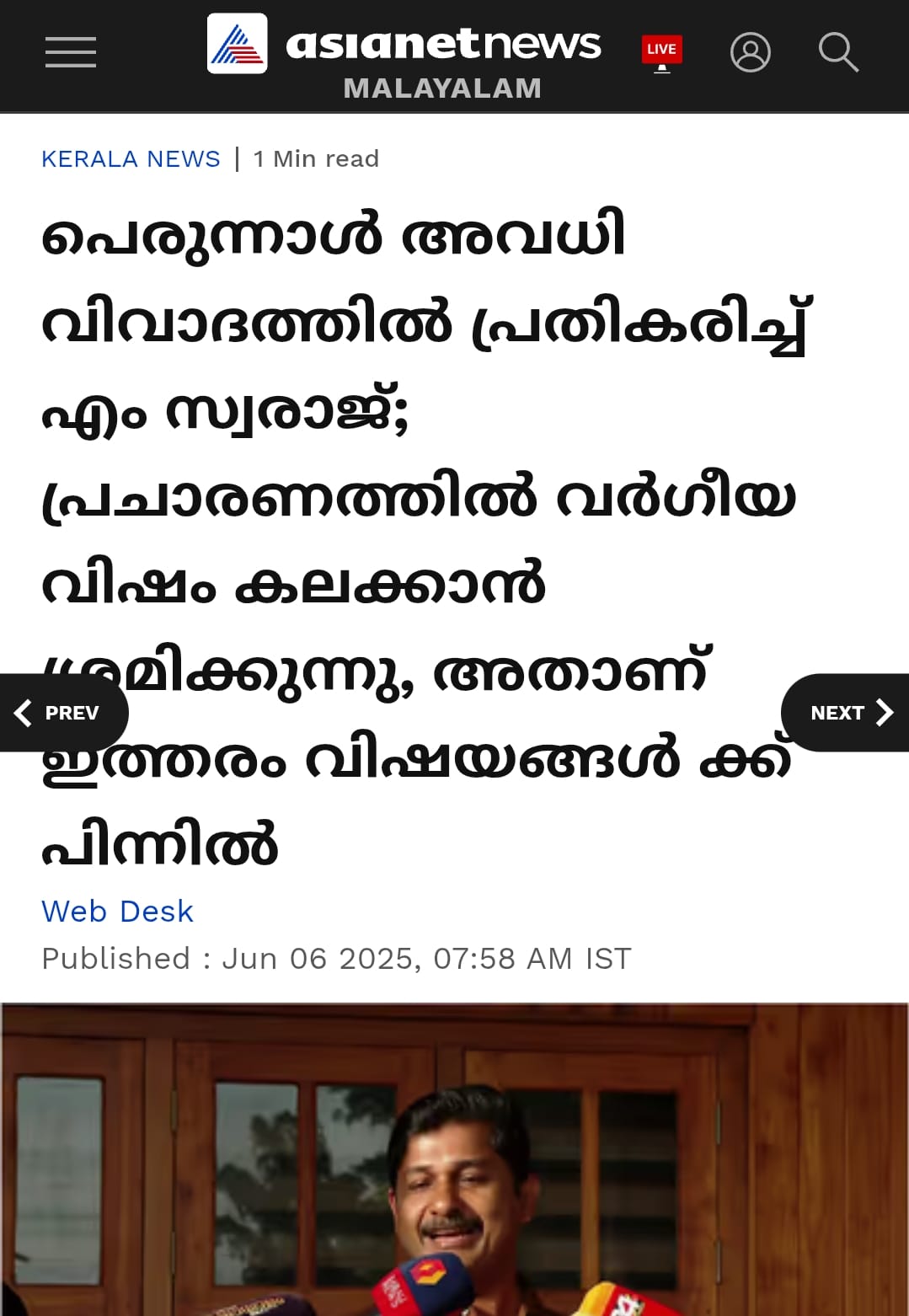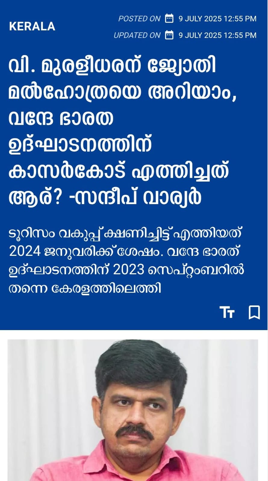 ജ്യോതി മൽഹോത്ര താൻ ക്ഷണിച്ചിട്ടല്ല വന്ദേഭാരതിന്റെ ഉദ്ഘാടന യാത്രയിൽ പങ്കെടുത്തതെന്ന് വി മുരളീധരൻ കൈകഴുകി. സംസ്ഥാന സർക്കാരിന് രക്ഷപ്പെടാനാണ് തന്റെ പേര് വലിച്ചിഴയ്ക്കുന്നത്. ഇതുകൊണ്ടൊന്നും ബിജെപിയെ പ്രതിരോധത്തിലാക്കാൻ കഴിയില്ല. (ജൂലൈ 8, റിപ്പോർട്ടർ).
