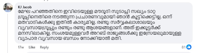 ഈ പോസ്റ്റിൽ അദ്ദേഹം എഴുതിയ കമന്റിൽ മേഘയുടെ ബഹിഷ്കരണാഹ്വാനത്തെയും എസ്ഐഒയുടെ ബഹിഷ്കരണാഹ്വാനത്തെയും പരസ്പരം താരതമ്യം ചെയ്തു. എസ്ഐഓയുടെ ബഹിഷ്കരാഹ്വാനത്തെ അംഗീകരിക്കാനാവില്ലെന്നായിരുന്നു അദ്ദേഹത്തിന്റെ അഭിപ്രായം: മതവാദികൾക്ക് ബഹിഷ്കരണത്തിൽ കാര്യമില്ല. സർവകലാശാല പോലെയല്ല, വ്യവസായഗ്രൂപ്പിന്റെ കാര്യം. മേഘ പറഞ്ഞതിനെ ഇവിടെയുള്ള മൗദൂദി സുടാപ്പി സഖ്യം ടാറ്റ ഗ്രൂപ്പിനെതിരെ നടത്തുന്ന പ്രചാരണവുമായി കൂട്ടിക്കെട്ടില്ല. ഒന്ന് മതവാദികൾക്കു ഇതിൽ കാര്യമില്ല. രണ്ട് സർവ്വകലാശാലയും വ്യവസായഗ്രൂപ്പും രണ്ടും രണ്ടു ആശയങ്ങളാണ്. അത് ഇക്കൂട്ടർക്ക് മനസിലാകില്ല. സംശയമുള്ളവർ അറബ് രാജ്യങ്ങൾക്കു ഇസ്രയേലുമായുള്ള വ്യാപാര വ്യവസായ ബന്ധം നോക്കിയാൽ മതി.