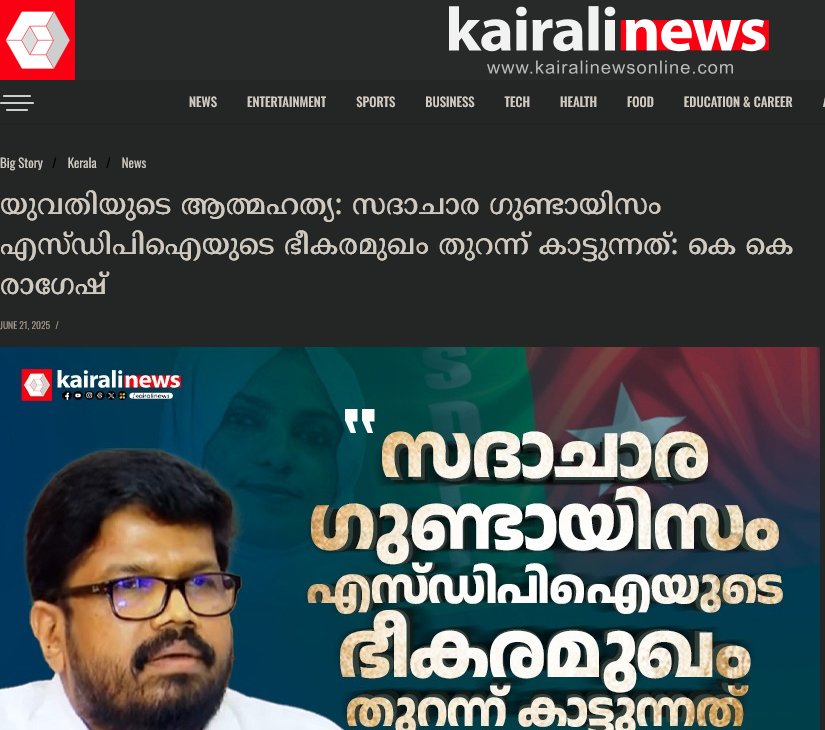 കായലോട് ആൾക്കൂട്ട വിചാരണ പുറത്ത് വന്നത് എസ്ഡിപിഐയുടെ വികൃതമുഖമാണെന്ന് മറ്റൊരിടത്തും അദ്ദേഹം ആക്ഷേപിച്ചു: സാമൂഹ്യ മാധ്യമങ്ങൾ ഉപയോഗിച്ച് യുവതിയെ അപമാനിച്ചു. യുവതി ആത്മഹത്യ ചെയ്തത് അപമാന ഭയത്താലാണ്. എസ്ഡിപിഐ ഓഫിസിൽ വിചാരണ നടന്നു. ആൺ സുഹൃത്ത് റഹീസിനെതിരെ എസ്ഡിപിഐ വ്യാജപ്രചാരണം നടത്തുന്നു. റഹീസിന് സിപിഐഎമ്മുമായി ബന്ധമില്ല. കോൺഗ്രസ് കുടുംബമാണ് റഹീസിന്റെത്. സ്ത്രീകൾ സമൂഹത്തിൽ എങ്ങനെ ജീവിക്കണമെന്ന് പോപ്പുലർഫ്രണ്ട്, എസ്ഡിപിഐ പ്രവർത്തകർ ഫത്വ ഇറക്കുന്നു. മതരാഷ്ട്രവാദം എന്ന എസ്ഡിപിഐയുടെ അടിസ്ഥാന ആശയമാണ് ഇത്തരം സംഭവങ്ങൾക്ക് പിന്നിൽ. താലിബാന് സമാനമായ പ്രവർത്തനമാണ് അവർ നടത്തുന്നത്. പോപ്പുലർഫ്രണ്ടും എസ്ഡിപിഐയും നേരത്തെയും ഇത്തരം പ്രവർത്തനങ്ങൾ നടത്തിയിട്ടുണ്ട്. കേരളം താലിബാന്റെ അഫ്ഗാൻ അല്ല. ഇത്തരം മതരാഷ്ട വാദികളാണ് കോൺഗ്രസ്സിന്റെ സഖ്യകക്ഷികൾ. എസ്ഡിപിഐ ഇപ്പോൾ കോൺഗ്രസ്സിന്റെ സഖ്യകക്ഷിയാണ്. കോൺഗ്രസ്സിന്റെയും ലീഗിന്റെ പിന്തുണ എസ്ഡിപിഐക്ക് വളരാൻ വളമാകുകയാണ്. കായലോട് സംഭവത്തിൽ കോൺഗ്രസ്സ് അവരുടെ നിലപാട് വ്യക്തമാക്കണം (‘കായലോട് യുവതി ആത്മഹത്യ ചെയ്തത് അപമാന ഭയത്താൽ; പുറത്ത് വന്നത് എസ്ഡിപിഐയുടെ വികൃതമുഖം, താലിബാന് സമാനം’: കെ കെ രാഗേഷ്, ജൂൺ 21, 24 ന്യൂസ്)