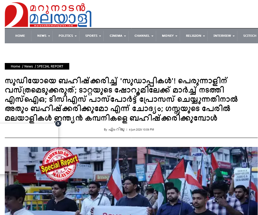 എസ്ഐഓയുടെ ബഹിഷ്കരണാഹ്വാനത്തെ ‘സുഡാപ്പികൾ ടാറ്റക്കെതിരേ’ എന്നാണ് മറുനാടൻ മലയാളിയുടെ വാർത്ത വിശേഷിപ്പിച്ചത്. ഇന്ത്യയെ വ്യാവസായികമായി വളർത്തുന്നതിൽ പങ്കുവഹിച്ചവരാണ് ടാറ്റയെന്നും വാർത്തയിൽ പറയുന്നു: ഇന്ത്യാക്കാരെ നേരിട്ട് ബാധിക്കാതെ, ലോകത്തിന്റെ മറ്റൊരു കോണിൽ നടക്കുന്ന പ്രശ്നത്തിന്റെ പേരിൽ ഒരു വിഭാഗം മലയാളികൾ ഒരു ഇന്ത്യൻ കമ്പനിയെ തന്നെ ബഹിഷ്കരിച്ചാൽ എങ്ങനെയിരിക്കും. അതും ഇന്ത്യയെ ഒരു വ്യാവസായിക ശക്തിയായി വളർത്തുന്നതിൽ നിർണ്ണായക പങ്കുവഹിച്ച ടാറ്റയെ തന്നെ. അത്തരമൊരു കോപ്രായവും കഴിഞ്ഞ ദിവസം കോഴിക്കോട് അരങ്ങേറി. ജമാഅത്തെ ഇസ്ലാമിയുടെ വിദ്യാർത്ഥി വിഭാഗമായ എസ്ഐഒയാണ്, ടാറ്റയുടെ വസ്ത്രനിർമ്മാണ ശൃഖലയായ സൂഡിയോവിലേക്ക് മാർച്ച് നടത്തുകയും കമ്പനിയെ ബഹിഷ്കരിക്കുന്നതായി പ്രഖ്യാപിക്കുകയും ചെയ്തത്. ഗസ്സയിലെ കുഞ്ഞുങ്ങളെയടക്കം കൊല്ലാക്കൊല ചെയ്യുന്ന ഇസ്രയേലിനെ പിന്തുണക്കുന്ന ബ്രാൻഡുകളെ തങ്ങൾ ബഹിഷ്ക്കരിക്കുമെന്നാണ് എസ്ഐഒ പറയുന്നത്. കോഴിക്കോട് സൂഡിയോ ഔട്ട്ലെറ്റിലേക്ക് ഇന്നലെ ഫലസ്തീൻ പതാകയുമായി എസ്ഐഒ മാർച്ചും നടത്തി. പ്രതിഷേധക്കാരെ ‘സുഡാപ്പികൾ’ എന്നാണ് വാർത്തയുടെ ശീർഷകത്തിൽ മറുനാടൻ മലയാളി വിശദീകരിച്ചത് (സുഡിയോയെ ബഹിഷ്ക്കരിച്ച് ‘സുഡാപ്പികൾ’! പെരുന്നാളിന് വസ്ത്രമെടുക്കരുത്; ടാറ്റയുടെ ഷോറൂമിലേക്ക് മാർച്ച് നടത്തി എസ്ഐഒ; ടിസിഎസ് പാസ്പോർട്ട് പ്രോസസ് ചെയ്യുന്നതിനാൽ അതും ബഹിഷ്ക്കരിക്കുമോ എന്ന് ചോദ്യം; ഗസ്സയുടെ പേരിൽ മലയാളികൾ ഇന്ത്യൻ കമ്പനികളെ ബഹിഷ്ക്കരിക്കുമ്പോൾ, ജൂൺ 4, മറുനാടൻ മലയാളി).