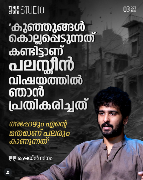 ഫലസ്തീനില് കുഞ്ഞുങ്ങളെ കൊല്ലുന്നത് കണ്ടിട്ടാണ് താന് പ്രതികരിച്ചതെന്നും എന്നാല് പലരും തന്റെ മതമാണ് അതില് കണ്ടതെന്നും നടന് ഷെയ്ന് നിഗം ദി ക്യൂ സ്റ്റുഡിയോ അഭിമുഖത്തില് പരാതിപ്പെട്ടു. ഇക്കാര്യത്തില് സോഷ്യൽ ഡിയയെ പലരും ടൂള് ആയി ഉപയോഗിക്കുകയാണെന്നും മനുഷ്യര്ക്ക് മാത്രമാണ് ഇത്തരം തെറ്റായ രീതികളുള്ളതെന്നും അദ്ദേഹം പറഞ്ഞു (കുഞ്ഞുങ്ങളെ കൊല്ലുന്നത് കണ്ടാണ് പലസ്തീന് വിഷയത്തില് ഞാന് പ്രതികരിച്ചത്. ഇന്നും ആ യുദ്ധം അവസാനിച്ചിട്ടില്ല. അവിടെയും എന്റെ മതമാണ് ആളുകള് നോക്കുന്നത്; ഷെയ്ന് നിഗം, ഒക്ടോബര് 3, ദി ക്യൂ സ്റ്റുഡിയോ).