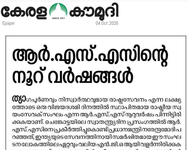 നൂറ് വര്ഷങ്ങള് പിന്നിട്ട ആര്എസ്എസ്സിനെക്കുറിച്ച് കേരള കൗമുദിയ ഒരു എഡിറ്റോറിയല് എഴുതി. ആര്എസ്എസ്സ് ഭാരതത്തിന്റെ സാംസ്കാരിക പാരമ്പര്യത്തെ വീണ്ടെടുത്തുവെന്ന് പുകഴ്ത്തുന്ന എഡിറ്റോറിയല് ആര്എസ്എസ്സ് മുന്നോട്ടുവയ്ക്കുന്ന വംശീയ രാഷ്ട്രീയത്തെ പരാമര്ശിച്ചില്ല: കാലക്രമത്തില് ക്ഷീണം സംഭവിച്ച ഭാരതത്തിന്റെ മഹത്തായ സാംസ്കാരിക പാരമ്പര്യം വീണ്ടെടുത്ത് രാഷ്ട്രത്തെ പുനര്നിര്മ്മിക്കുക എന്ന ദൗത്യത്തിനായി സ്വയം സമര്പ്പിച്ച, അധികാരത്തില് നിന്നും ആഢംബരങ്ങളില് നിന്നും അകന്നുനിന്ന ആയിരക്കണക്കിന് അംഗങ്ങളുടെ അച്ചടക്കപൂര്ണവും ആദര്ശപൂര്ണവുമായ നിസ്വാര്ത്ഥ പ്രവര്ത്തനമാണ് ഈ സംഘടനയെ നൂറുവര്ഷം മുമ്പുള്ള ഒരു വിത്തില് നിന്ന് ഇന്ന് ഭാരതമെമ്പാടും പടര്ന്നു നില്ക്കുന്ന വലിയ ആല്മരമായി വളര്ത്തിയത്. സാമൂഹ്യ പരിവര്ത്തനത്തിനൊപ്പം ഹിന്ദുക്കളുടെ ഉന്നമനത്തിനാണ് ആര്എസ്എസ് പരമമായ പ്രാധാന്യം നല്കുന്നത്. ഭാരതത്തിന്റെ ആത്മീയ, ധാര്മ്മിക മൂല്യങ്ങളെ സംരക്ഷിക്കുന്നതിന് ജനാധിപത്യത്തിലെ മറ്റ് രാഷ്ട്രീയ കക്ഷികളെപ്പോലെയുള്ള ഒരു സംഘടനയ്ക്ക് കഴിയില്ലെന്നും, സൈനിക ചിട്ടകളോടെ അച്ചടക്കപൂര്ണവും അധികാരത്തില് നിന്ന് അകലം പാലിച്ചും പ്രവര്ത്തിക്കുന്ന സ്വയം സേവകര്ക്ക് മാത്രമേ നിര്ണായക ഘട്ടങ്ങളില് മാതൃരാജ്യത്തെ സംരക്ഷിക്കാനും പരിപോഷിപ്പിക്കാനും കഴിയൂ എന്നുമുള്ള വിശ്വാസപ്രമാണത്തിന്റെ വെളിച്ചത്തിലാണ് ആര്എസ്എസ് ഇത്രകാലവും പ്രവര്ത്തിച്ചുവരുന്നത്.