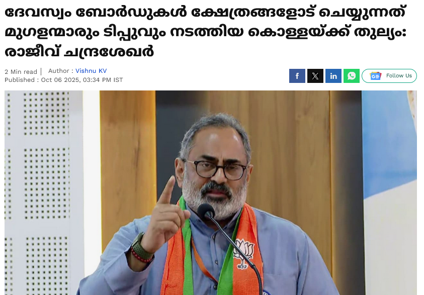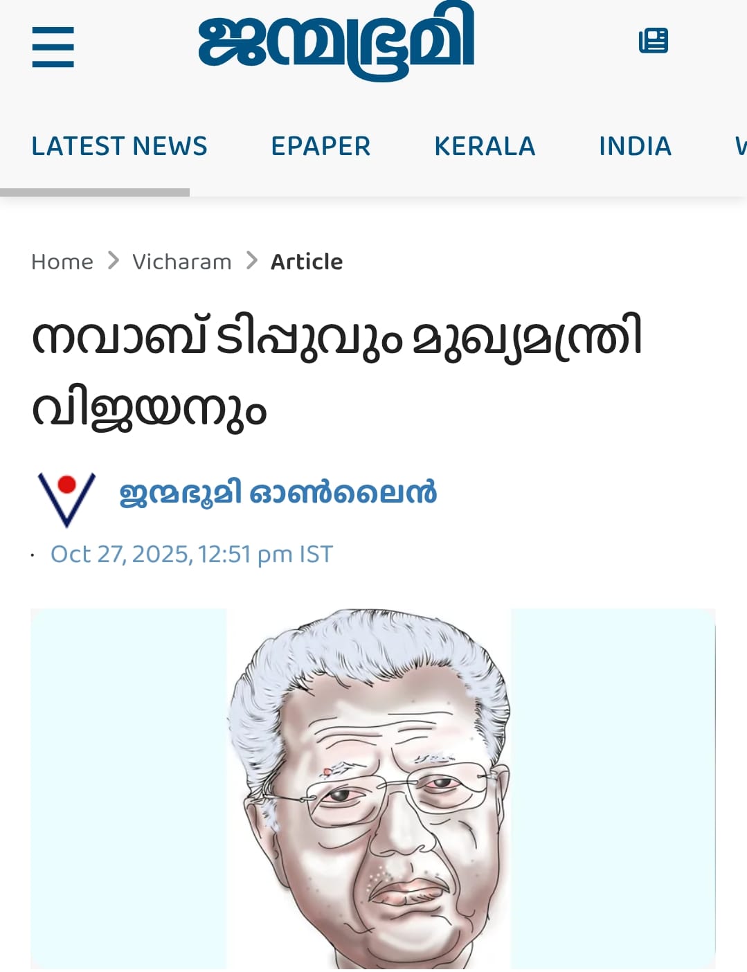 ശബരിമല സ്വര്ണമോഷത്തെക്കുറിച്ച് ജന്മഭൂമി പ്രസിദ്ധപ്പെടുത്തി ഒരു ലേഖനത്തില് മുഖ്യമന്ത്രി പിണറായി വിജയനെ ടിപ്പുവുമായി താരതമ്യപ്പെടുത്തി. രണ്ട് പേരും ഹിന്ദു വിരുദ്ധരും ക്ഷേത്രം കൊള്ളയടിക്കുന്നവരുമാണെന്നാണ് ലേഖനം ആരോപിച്ചത്: മൈസൂര് നവാബായിരുന്ന അക്രമകാരി ടിപ്പുവും കേരളത്തിന്റെ വടക്ക് നിന്ന് മുഖ്യമന്ത്രി പദവിയിലേക്ക് വന്ന പിണറായിക്കാരന് വിജയനും തമ്മില് വിഷയത്തിലും സമാനതകള് ഏറെയാണ്. മൈസൂര് നവാബ് ഭീഷണിയിലൂടെയും കൂട്ടക്കുരുതിയിലൂടെയും ഇസ്ലാമിന്റെ ഭീകര മുഖമാണ് മലയാളിക്ക് നല്കിയതെങ്കില് കാലോചിതമായ മാറ്റങ്ങളോടെ വീട്ടിലെ വിവാഹബന്ധം വഴി പിണറായി വേറിട്ടൊരു രീതിയിലാണ് ഇസ്ലാമിനെ പരിചയപ്പെടുത്തിയത്. മൈസൂര് നവാബും പിണറായി വിജയനും തികഞ്ഞ ഏകാധിപതികളാണ്. നിര്ബന്ധിത മതപരിവര്ത്തനത്തിന് ടിപ്പു പരീക്ഷിച്ച് വിജയിച്ച ഭയപ്പെടുത്തി കീഴ്പ്പെടുത്തുക എന്ന നയം തന്നെയാണ് വിജയനും നടപ്പാക്കി വരുന്നത്. വിജയന്റെ സഹയാത്രികരായ പോപ്പുലര് ഫ്രണ്ടുകാരും ഈ നയമാണ് നടപ്പാക്കുന്നത്. പതിനെട്ടാം നൂറ്റാണ്ടില് ഇസ്ലാമിന്റെ പേരില് വംശഹത്യ നടത്തിയ ടിപ്പുവും ഇരുപതാം നൂറ്റാണ്ടിന്റെ ഒടുവിലും ഇരുപത്തിയൊന്നാം നൂറ്റാണ്ടിന്റെ തുടക്കത്തിലും കമ്മ്യൂണിസത്തിന്റെ പേരില് നിരവധി കൊലപാതകങ്ങള് ആസൂത്രണം ചെയ്തു നടപ്പാക്കുകയും ക്ഷേത്ര മുതലുകള് കൊള്ളയടിക്കുകയും ചെയ്യുന്ന പിണറായിയും തമ്മില് സമാനതകളേറെയാണ് (നവാബ് ടിപ്പുവും മുഖ്യമന്ത്രി വിജയനും, ഒക്ടോബര് 27, ജന്മഭൂമി പത്രം).