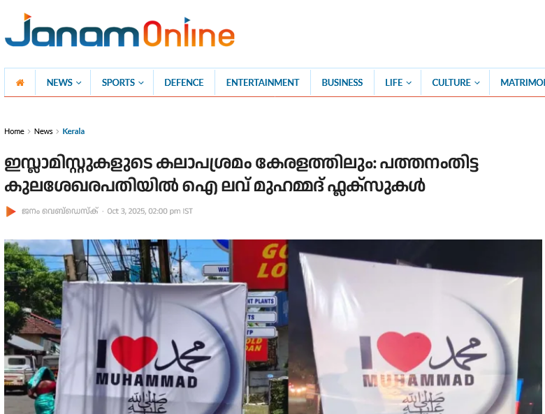 പത്തനംതിട്ട കുലശേഖരപതിയിലെ ഫ്ലക്സിനെക്കുറിച്ചാണ് വാര്ത്ത. യുപിയില് ഉണ്ടായത് കലാപശ്രമമാണെന്നും സമാനമായ ശ്രമമാണ് പത്തനംതിട്ടയിലേതുമെന്നും വാര്ത്തയില് പറയുന്നു. അതിനെക്കുറിച്ച് അന്വേഷിക്കണമെന്നും ആവശ്യപ്പെട്ടിട്ടുണ്ട് (ഇസ്ലാമിസ്റ്റുകളുടെ കലാപശ്രമം കേരളത്തിലും: പത്തനംതിട്ട കുലശേഖരപതിയില് ഐ ലവ് മുഹമ്മദ് ഫ്ലക്സുകള്, ഒക്ടോബര് 3, ജനം ടിവി).