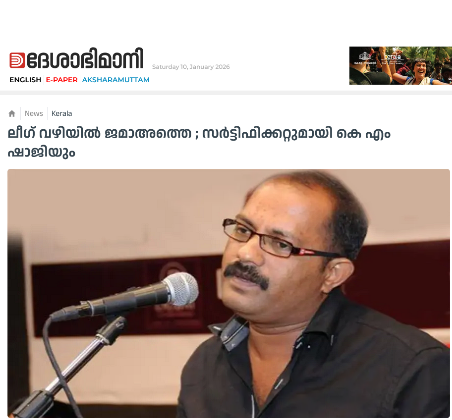 ഭരണവും മുസ്ലീങ്ങളുമായി ബന്ധപ്പെട്ട് കെ.എം ഷാജി നടത്തിയ പ്രസംഗത്തിനെതിരേ കേസരി ലേഖനം: ഷാജി പറഞ്ഞത് കുറഞ്ഞുപോയോ എന്നേ കോണ്ഗ്രസ് നേതാവ് രമേശ് ചെന്നിത്തലക്കു സംശയമുള്ളു. കേരളം എന്നല്ല ഇന്ത്യ തന്നെ ഭരിക്കേണ്ടത് മുസ്ലീം സമുദായത്തിന് വേണ്ടിയാണോ എന്ന കാര്യത്തിലേ സംശയമുള്ളൂ. മുഹമ്മദ് ബിന് കാസിം മുതല് അവസാനത്തെ മുഗള രാജാവുവരെ ശ്രമിച്ചിട്ടും ഈ രാജ്യത്തെ ഇസ്ലാമികവല്ക്കരിക്കാനായില്ലെങ്കിലും കോണ്ഗ്രസ്സിനെ ഇസ്ലാമികവല്ക്കരിക്കാനും ലീഗിന്റെ കയ്യിലെ പാവയാക്കാനും അവര്ക്കു സാധിച്ചു. രാഹുലിനും പ്രിയങ്കക്കും വരെ പാര്ലമെന്റിലെത്തണമെങ്കില് ലിഗിന്റെ കനിവു വേണം. ഷാജിയേക്കാള് വിഷമുള്ള ജമാഅത്തെ ഇസ്ലാമിയും പോപ്പുലര് ഫ്രണ്ടും ഇന്ന് യു.ഡി.എഫിന്റെ മാളത്തിലാണ്. വരാനിരിക്കുന്ന തിരഞ്ഞെടുപ്പില് യു.ഡി. എഫിന്റെ പ്രകടനപത്രികയില് ‘കേരളത്തിന്റെ മോചനം ഇസ്ലാമിലൂടെ’ എന്നുകൂടി ചേര്ത്താല് സംഗതി കുശാലായി (യുഡിഎഫ് ഭരണം വന്നാല് ‘കേരളത്തിന്റെ മോചനം ഇസ്ലാമിലൂടെ, ശാകല്യന്, കേസരി, ഒക്ടോബര് 26).