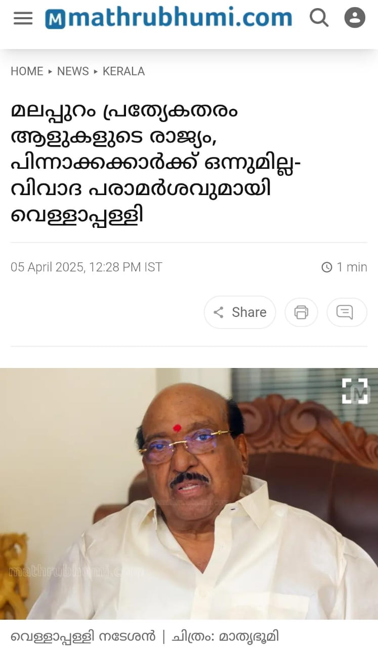 എൻഡിഎ സ്ഥാനാർഥി മോഹൻ ജോർജിന്റെ വിജയത്തിനായി വഴിക്കടവ്, മൂത്തേടം പഞ്ചായത്തുകളിൽ നടന്ന ബിഡിജെഎസ് കുടുംബ സംഗമങ്ങളിൽ സംസാരിക്കുമ്പോഴും ഇതേ കാര്യം തുഷാർ പരാമർശിച്ചു: എസ്എൻഡിപി യോഗം ജനറൽ സെകട്ടറി വെള്ളാപ്പള്ളി നടേശന്റെ മലപ്പുറം പരാമർശം രാഷ്ടീയ കേരളം എക്കാലവും ചർച്ചചെയ്യും. ഭൂരിപക്ഷ ജനവിഭാഗം ന്യൂനപക്ഷങ്ങളാൽ മാത്രം ഭരിക്കപ്പെടുന്നത് ജനാധിപത്യമല്ല. വർഗീയത ഇല്ലാത്തവരും ദേശീയതയും ഭരണഘടനയും സംരക്ഷിക്കുന്നവരുമായിരിക്കണം മലപ്പുറം ഭരിക്കേണ്ടത് എന്നാണ് വെള്ളാപ്പള്ളി പറഞ്ഞതിന്റെ സാരാംശം. ലീഗുകാർ വൈകാരികമായി ഇത് ഏറ്റുപിടിച്ചു. മുസ്ലീം ലീഗ് ജനാധിപത്യ മതേതര പാർട്ടിയല്ല (ജൂൺ 16, മനോരമ ഓൺലൈൻ).