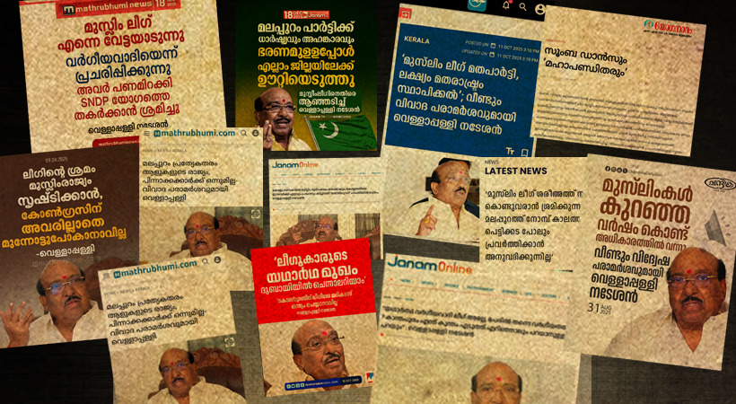2025 ഏപ്രിൽ 5നും ഡിസംബർ 16നും ഇടയ്ക്ക് വെള്ളാപ്പള്ളി നടേശൻ നടത്തിയ ഇസ്ലാമോഫോബിക് വിദ്വേഷ പ്രസ്താവനകളുടെ രേഖാശേഖരം. ഈ കാലയാളവിൽ വെള്ളാപ്പള്ളി കേരളത്തിലങ്ങോളമിങ്ങോളം എസ്എൻഡിപി നേതൃയോഗങ്ങൾ നടത്തി. മാധ്യമങ്ങൾക്ക് അഭിമുഖങ്ങൾ നൽകി. നിരവധി സ്ഥലങ്ങളിൽ പ്രസംഗിച്ചു. വി.എസ് അച്യുതാനന്ദൻ, എ.കെ ആന്റണി, തുടങ്ങിയ സിപിഎം – കോൺഗ്രസ് നേതാക്കളുടെ മുസ്ലീം വിരുദ്ധമെന്ന് വ്യാഖ്യാനിക്കപ്പെട്ട പ്രസംഗങ്ങൾ കൂട്ടിയോജിപ്പിച്ചുകൊണ്ടുള്ള വീഡിയോ ക്ലിപ്പുകൾ പ്രദർശിപ്പിച്ച ശേഷമാണ് വെള്ളാപ്പള്ളി പല സ്ഥലങ്ങളിലും എസ്എൻഡിപി പരിപാടികളിൽ പ്രസംഗം തുടങ്ങുന്നത്. മിക്കവാറും എല്ലാ യോഗത്തിലും ബിഡിജെഎസ് നേതാവ് തുഷാർ വെള്ളാപ്പള്ളി പങ്കെടുത്തിരുന്നു (മുസ്ലീം വിരുദ്ധ ക്യാമ്പയിനുമായി വെള്ളാപ്പള്ളി, ആഗസ്റ്റ് 26, സിറാജ്).
