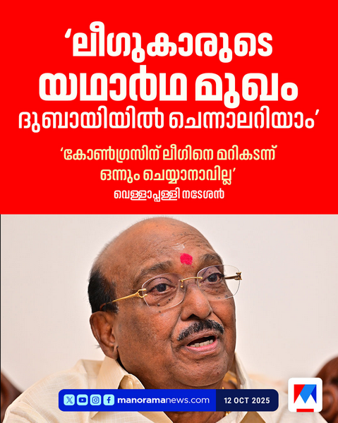ലീഗിന്റെ യഥാർത്ഥ മുഖം ദുബായിൽ ചെന്നാലറിയാമെന്ന് എസ്എൻഡിപി ജനറൽ സെക്രട്ടറി വെള്ളാപ്പള്ളി നടേശൻ. കോൺഗ്രസ്സിന് ലീഗിനെ മറികടന്ന് ഒന്നും ചെയ്യാനാവില്ലെന്നും അദ്ദേഹം പറഞ്ഞു (ലീഗുകാരുടെ യഥാർത്ഥ മുഖം ദുബായിൽ ചെന്നാലിയാം-വെള്ളാപ്പള്ളി, ഒക്ടോബർ 12, മനോരമ).