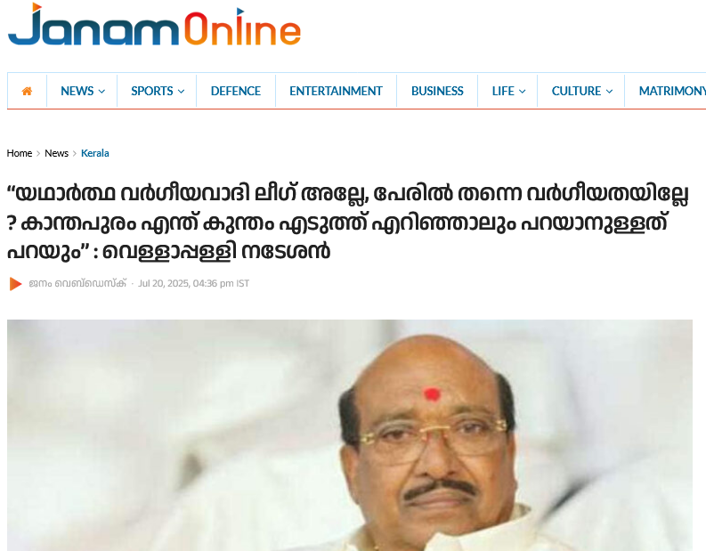 സ്കൂൾ സമയ മാറ്റത്തിലെ സമസ്ത നിലപാടിനെ വെള്ളാപ്പള്ളിയും എതിർത്തു: കാന്തപുരം പറയുന്നത് കേട്ട് ഭരിച്ചാൽ മതി കേരളാ ഗവൺമെന്റ് എന്ന സ്ഥിതിയാണ് ഉള്ളത്. സൂംബ വിവാദം ഇതിന്റെ ഭാഗമാണ്. സ്കൂൾ സമയം മാറ്റവും ഇതിന്റെ ഭാഗമാണ്. കുട്ടികൾക്ക് സ്കൂളിൽ സൂംബ ഡാൻസ് ഏർപ്പെടുത്തി. അതിനെയും എതിർത്തു. സർക്കാർ എന്ത് നിയമം കൊണ്ടുവന്നാലും മലപ്പുറത്ത് പോയി ചോദിച്ചിട്ടില്ലെങ്കിൽ നടപ്പാക്കുകയില്ല. വിദേശത്ത് നടപ്പാക്കിയതാണ് സർക്കാർ കൊണ്ടുവന്നത്. അപ്പോഴേക്കും അത് മുസ്ലീം വിരുദ്ധമാണെന്ന് പറയുകയാണ്. അവർ ഇരിക്കാൻ പറഞ്ഞാൽ കിടന്നുകൊടുക്കുന്ന സർക്കാറാണ് (കേരളം വൈകാതെ മുസ്ലീം ഭൂരിപക്ഷപ്രദേശമാകും; കേരളത്തിലെ ഈഴവർക്ക് ഏറ്റവും പ്രാധാന്യം കിട്ടുന്നത് ‘തൊഴിലുറപ്പ്’ പദ്ധതിയിൽ മാത്രം; വെള്ളാപ്പള്ളി നടേശൻ, ജൂലൈ 19, ജനം ടിവി; ‘കാന്തപുരം പറയുന്നത് കേട്ട് കേരള സർക്കാർ ഭരിച്ചാൽ മതിയെന്ന സ്ഥിതിയാണ്,’: വെള്ളാപ്പള്ളി നടേശൻ, ജൂലൈ 19, മീഡിയാവൺ).