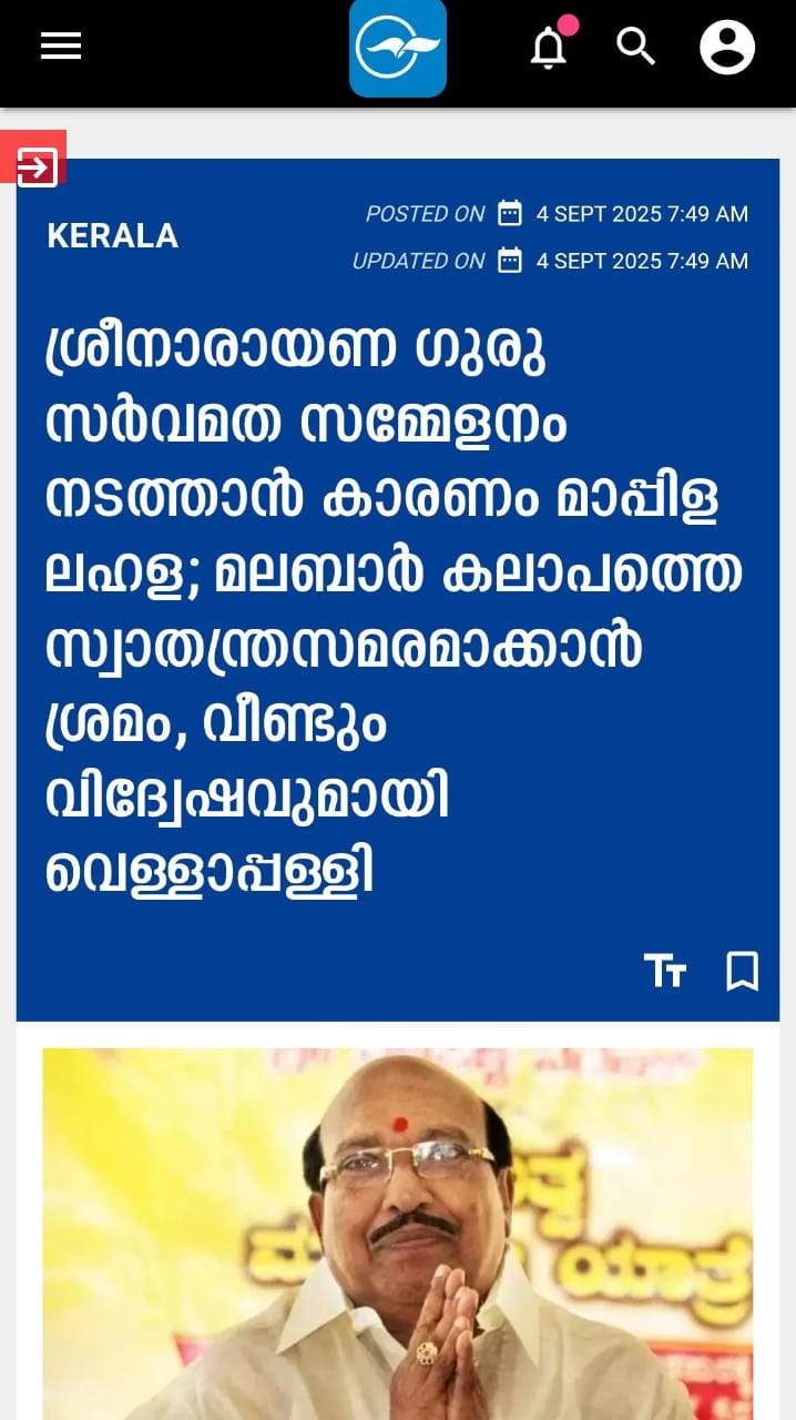 ഹരിപ്പാട് കാർത്തികപ്പള്ളി എസ്എൻഡിപി യൂണിയനിലെ ശാഖാ നേതൃസംഗമ ഉദ്ഘാടനത്തിൽ വീണ്ടും വെള്ളാപള്ളിയുടെ വിദ്വേഷ പ്രസ്താവന (ആഗസ്റ്റ് 6, മെട്രോ വാർത്ത): ‘ചില സമുദായക്കാർ അവരുടെ ആളിനെനോക്കി വോട്ടുചെയ്യും. എന്നാൽ, ഈഴവർ ആർക്കുവേണമെങ്കിലും വോട്ടുചെയ്യുന്ന അവസ്ഥയാണുള്ളത്. കുട്ടനാട്ടിൽ മുഴുവൻ പേര് പോലും അറിയാത്ത പാർട്ടിയുടെ, ഒരു കെട്ടുവള്ളത്തിൽ കയറാൻ പോലും ആളില്ലാത്ത പാർട്ടിയുടെ, സ്ഥാനാർഥിയെയാണ് വോട്ട് ചെയ്തു വിജയിപ്പിച്ചത്. അധികാരം ഘടകകക്ഷികൾ പങ്കിട്ടെടുക്കുകയാണ്. സമ്പത്തും വ്യവസായവും ഭൂമിയും വിദ്യാഭ്യാസവുമെല്ലാം ന്യൂനപക്ഷമാണെന്ന് പറയുന്നവർ കൈയ്യാളുകയാണ്. മറ്റുള്ളവർക്ക് ഒന്നും കിട്ടുന്നില്ല. ഈഴവർക്ക് തൊഴിലുറപ്പിൽ മാത്രമാണ് നല്ല പ്രാതിനിധ്യമുള്ളത്. സമുദായാംഗങ്ങൾ തൊഴിലിനുവേണ്ടി യാചിക്കുകയാണ്. നിലയ്ക്കലിൽ പള്ളിക്കായി പ്രമേയം പാസാക്കുകയും ബാബറി മസ്ജിദ് തകർത്തതിനെതിരെ തെരുവിലിറങ്ങുകയും ചെയ്ത സമുദായമാണ് നമ്മളുടേത്. എന്നാൽ, പൊലീസ് ശിവഗിരി തല്ലിത്തകർത്തപ്പോൾ ഒപ്പം നിൽക്കാൻ ആരെയും കണ്ടില്ല’