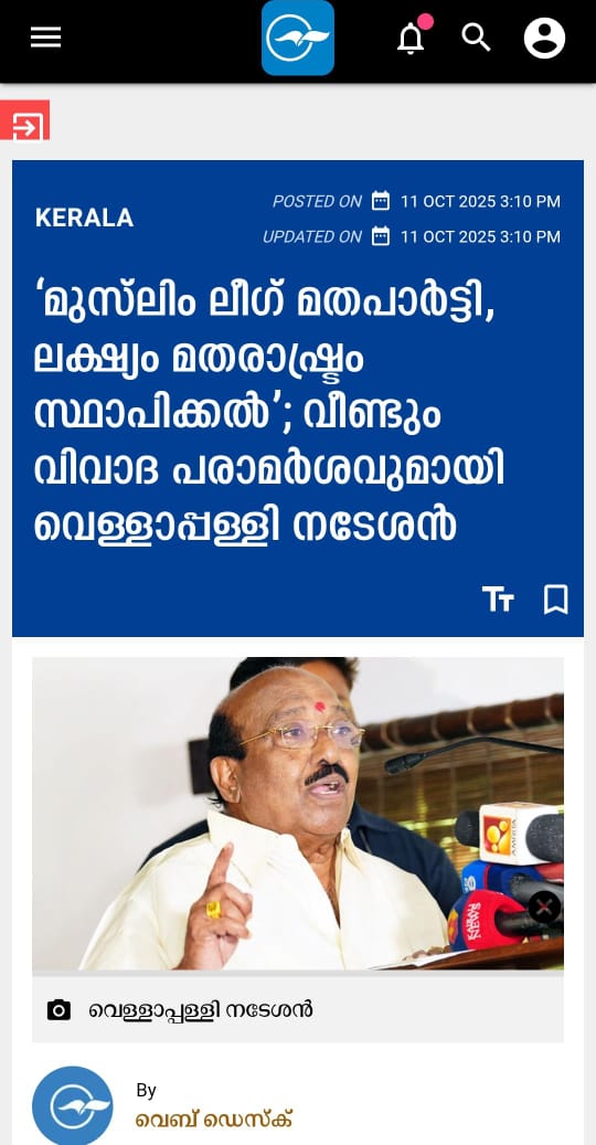 ലീഗിൽ പാകിസ്താൻ മനോഭാവമുള്ളവരുണ്ടെന്നും കെ.എം ഷാജി അത്തരക്കാരനാണെന്നും കൂടി വെള്ളാപ്പള്ളി പറഞ്ഞു (സ്വർണപ്പാളി വിവാദം; പ്രതിപക്ഷം കാണിക്കുന്നത് അസംബന്ധം, അനാവശ്യ ചർച്ചകളാണെല്ലാം: വെള്ളാപ്പള്ളി, ഒക്ടോബർ 10, മീഡിയാവൺ).