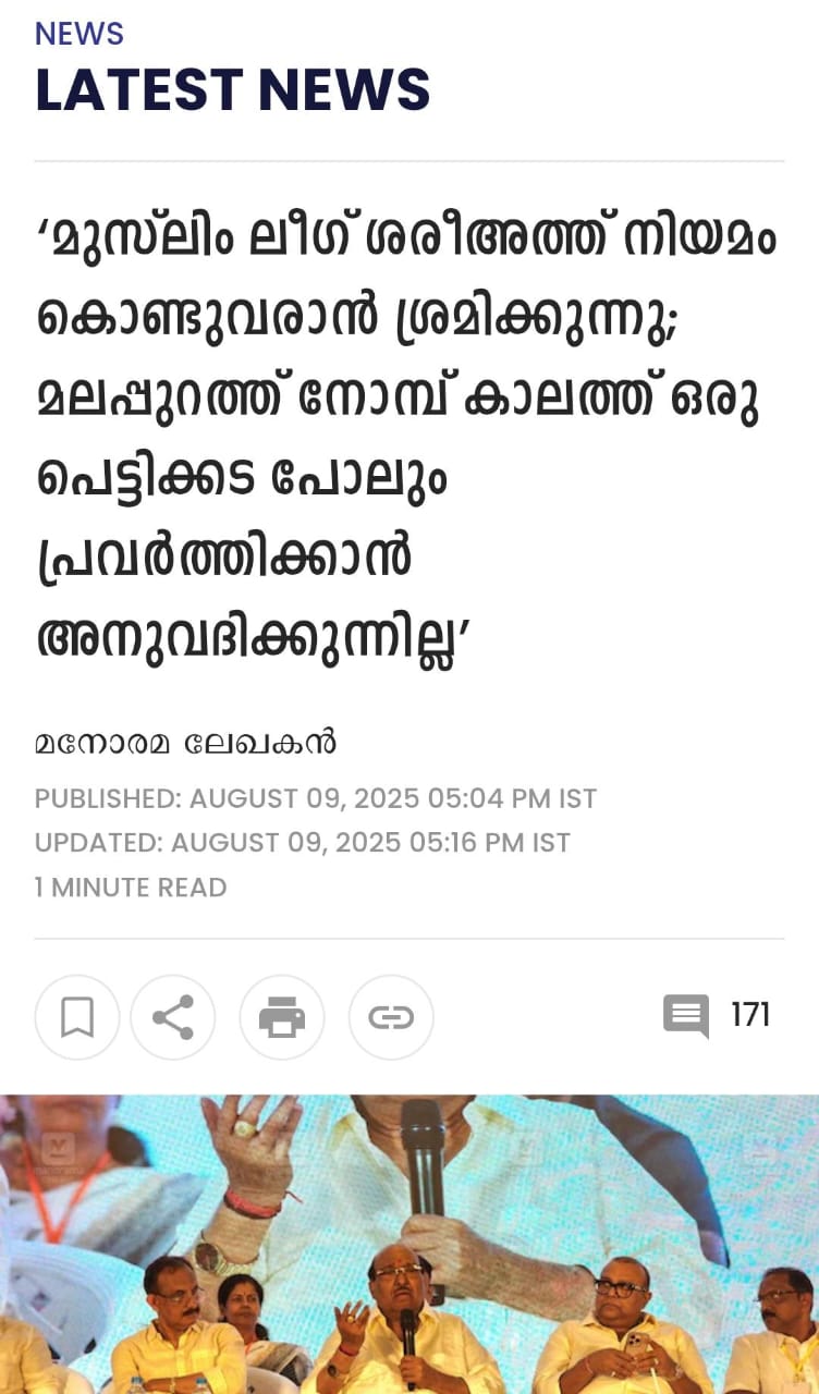 നിലമ്പൂരിൽ കണ്ടത് മുസ്ലീം ലീഗിന്റെ വിജയമാണെന്നും അവിടെ ഉയരുന്നത് ലീഗിന്റെ കൊടികളാണെന്നും വെള്ളാപ്പള്ളി നടേശൻ ചൂണ്ടിക്കാട്ടി: നിലമ്പൂർ ഉപതെരഞ്ഞെടുപ്പിൽ ഹിന്ദു മുസ്ലീം വികാരമുണ്ടായി. ഹിന്ദുവോട്ടുകൾ എൽഡിഎഫിന് ലഭിച്ചു. നിലമ്പൂരിൽ കണ്ടത് മുസ്ലീം ലീഗിന്റെ വിജയം. ഉയരുന്നത് ലീഗിന്റെ കൊടി. സ്വരാജ് മികച്ച പ്രകടനം കാഴ്ചവച്ചു. അഭിമാനകരമായ വോട്ട് നേടാൻ സാധിച്ചു. പി.വി അൻവറിനും അഭിമാനകരമായ വോട്ട് നേടാൻ സാധിച്ചു. ബിജെപിക്ക് 12,000 വോട്ടുകൾ ഉണ്ടായിരുന്നു. അത് കിട്ടില്ലെന്ന് ഞാൻ നേരത്തെ പറഞ്ഞതാണ്. കാരണം ഒരു മുസ്ലീം വികാരം ലീഗ് ഇളക്കിവിട്ടിരുന്നു. അതുകൊണ്ടുതന്നെ മറുഭാഗത്ത് ഒരു ഹിന്ദു വികാരവും ഉണ്ടായി’-വെള്ളാപ്പള്ളി നടേശൻ പറഞ്ഞു (ജൂൺ 23, മീഡിയാവൺ).