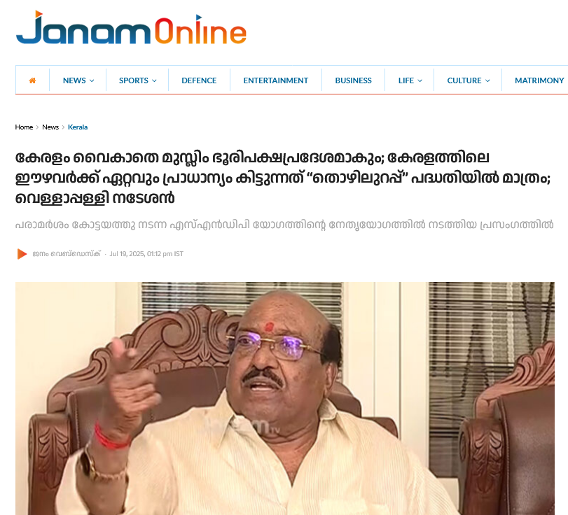 കേരളത്തിലെ ഈഴവർക്ക് ഏറ്റവും പ്രാധാന്യം കിട്ടുന്നത് ‘തൊഴിലുറപ്പ്’ പദ്ധതിയിൽ മാത്രമാണെന്നും കേരളം വൈകാതെ വിഎസ്സ് പറഞ്ഞതുപോലെ മുസ്ലീം ഭൂരിപക്ഷ നാടാകുമെന്നും വെള്ളാപ്പള്ളി നടേശൻ. കേരളത്തിലെ എൽഡിഎഫ്-യുഡിഎഫ് മുന്നണികൾ മുസ്ലീം സമുദായത്തെയാണ് സഹായിക്കുന്നത്. കേരളത്തിൽ മുസ്ലീം ലീഗാണ് കൂടുതൽ സീറ്റിൽ മത്സരിക്കുന്നത്. കേരളത്തിൽ രണ്ട് നിയമസഭാ മണ്ഡലം കുറഞ്ഞു. അപ്പോൾ കൂടിയത് മലപ്പുറത്തതാണ്. അപ്പോൾ മുസ്ലീം സമുദായം ജനസംഖ്യ വർദ്ധിപ്പിക്കുവാൻ തുടങ്ങി.നമ്മൾ ജനസംഖ്യ നിയന്ത്രിച്ചാൽ ഇല്ലാതാവും.കേരളത്തിൽ മുസ്ലീം ലീഗ് കൂടുതൽ സീറ്റ് മത്സരിക്കുന്നു. എന്നിട്ട് മുഖ്യമന്ത്രി സ്ഥാനമാണ് അവർ ലക്ഷ്യം ഇടുന്നത്. കോട്ടയത്ത് നടന്ന എസ്എൻഡിപി യോഗത്തിന്റെ നേതൃയോഗത്തിൽ നടത്തിയ പ്രസംഗത്തിലേതാണ് ഈ പരാമർശം (കേരളം വൈകാതെ മുസ്ലീം ഭൂരിപക്ഷപ്രദേശമാകും; കേരളത്തിലെ ഈഴവർക്ക് ഏറ്റവും പ്രാധാന്യം കിട്ടുന്നത് ‘തൊഴിലുറപ്പ്’ പദ്ധതിയിൽ മാത്രം; വെള്ളാപ്പള്ളി നടേശൻ, ജൂലൈ 19, ജനം ടിവി).