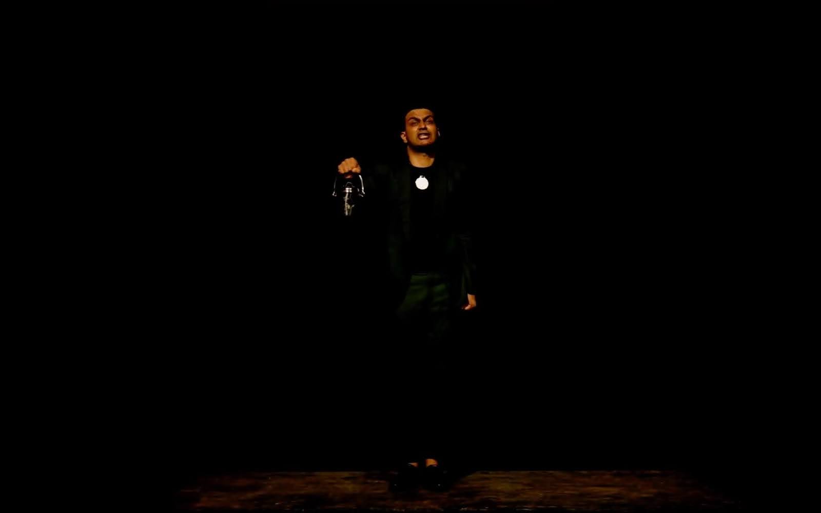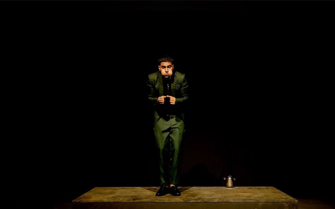 വളരെ വിശാലമായിരുന്നു വേദി. ഒരേയൊരു നടൻ മാത്രമായിരുന്നു ഉണ്ടായിരുന്നത്. നാടകം തീരുന്നതുവരെ ഒരിടത്തേക്കും നീങ്ങാതെ നടൻ നിന്ന നിൽപ്പിൽതന്നെ തുടർന്നു. റിപ്പബ്ലിക് ദിനപരേഡുകളിൾ കേന്ദ്ര സ്ഥാനത്തുനിന്ന് ആയിരക്കണക്കിന് പട്ടാളക്കാർക്ക് മൈതാനം മുഴുവൻ കേൾക്കത്തക്ക ശബ്ദത്തിൽ വലിയ അലർച്ചയോടെ, അച്ചടക്കത്തോടെ നിരയൊപ്പിച്ച് ചലിക്കാൻ നിർദ്ദേശം കൊടുക്കുന്ന കമാൻഡർ-ഇൻ-ചീഫ് ആണ് അയാൾ. അയാളുടെ കഴുത്തിൽ ഒരു മെഡൽ ഉണ്ട്. അത് വെളിച്ചം തട്ടി തിളങ്ങി കൊണ്ടിരിക്കുന്നുണ്ട്. വെളിച്ചത്തെ ഉപയോഗിച്ചത് പ്രധാനമായും അതിനു മാത്രമായിരുന്നു എന്നും പറയാം. മറ്റൊരു ശക്തമായ പ്രോപ്പർട്ടി വിശാലമായ സ്റ്റേജിലെ വിജനതയായിരുന്നു.